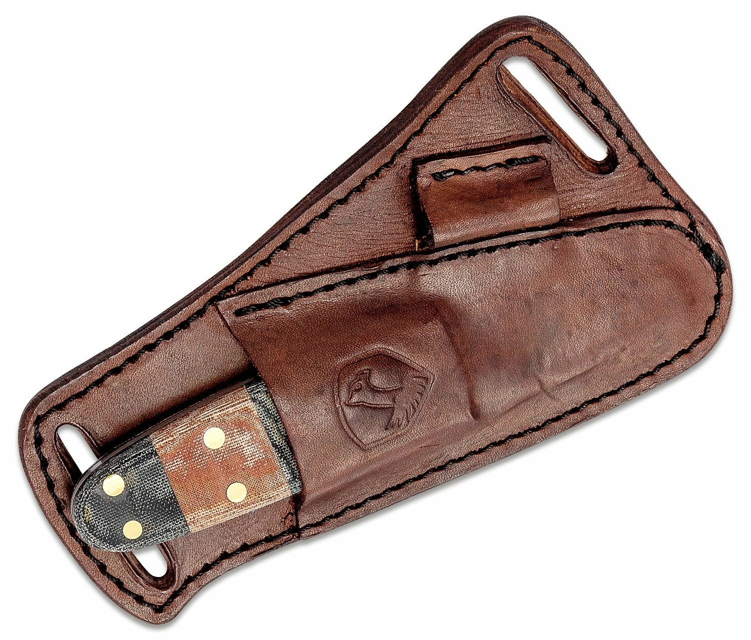 Ročaj iz trpežne micarte v rjavo‑črni izvedbi nudi zanesljiv oprijem tudi v mokrem. Medeninasti zakovice dodajajo stabilnost in estetiko. Nož je dobavljen s kakovostno usnjeno nožnico za udobno in varno nošenje na pasu.