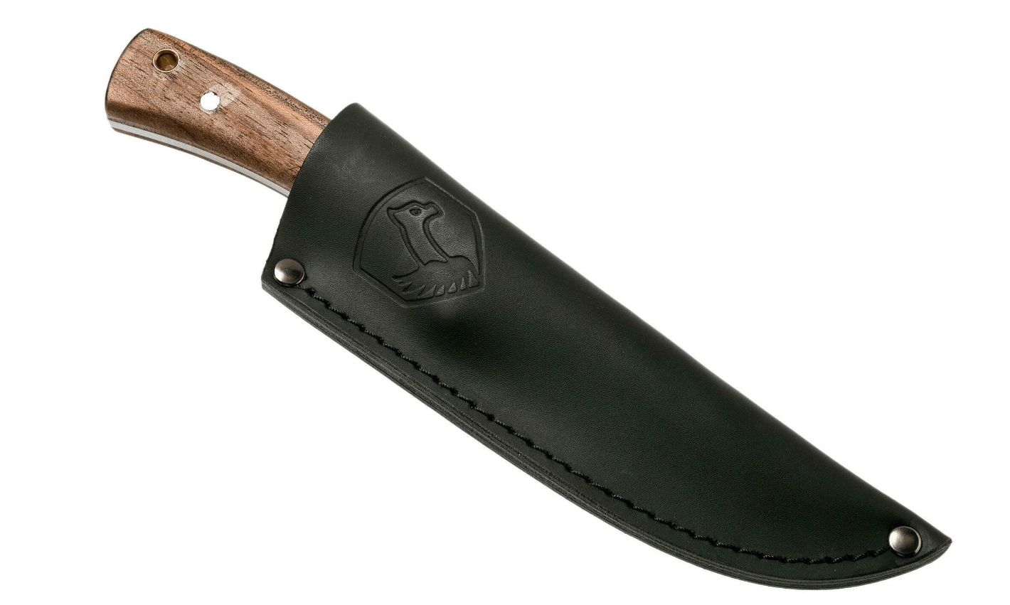 Ergonomski ročaj iz orehovega lesa odlično sede v dlan in nudi zanesljivost pri batoning-u, pripravi hrane in natančnejšem delu. Na koncu ročaja je praktična odprtina za vrvico za boljše zavarovanje pri nošenju. V paketu je kakovostna usnjena nožnica v temnem videzu za varno in elegantno shranjevanje noža.