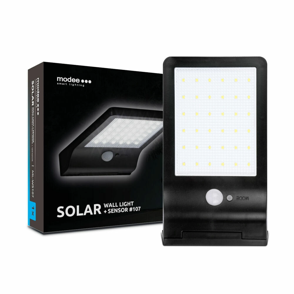 Sončna svetilka MODEE Smart Lighting 107 je idealna izbira za osvetlitev vhodnih vrat, ograje, terase ali vrtnega kotička tam, kjer ni na voljo elektrike. Vgrajen polikristalni sončni panel čez dan polni baterijo, po temi se luč samodejno vklopi. Ob zaznavi gibanja na razdalji približno 3–5 m poveča svetilnost na okoli 300 lm in po 10–20 s brez gibanja preide nazaj na zastrto orientacijsko svetlobo 3–5 lm.