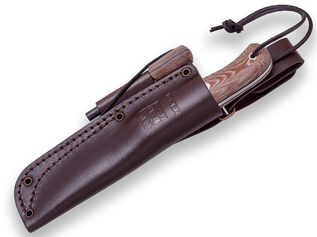 Ročaj iz kompozitnega materiala Micarta v rjavi barvi odlično drži tudi vlažen, dopolnjuje ga luknja za vrvico. Na terenu boste cenili kakovosten usnjeni etui za varno nošenje in vgrajeno kresilo za enostaven prižig ognja.