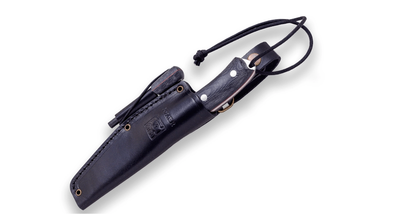 Ročaj iz Micarte v črni izvedbi z rdečimi poudarki odlično sede v roko tudi v mokrem. Nož dopolnjuje kakovostna usnjena nožnica za varno nošenje, praktično kresilo za netenje ognja in paracord (2 m) za nujne primere v naravi.