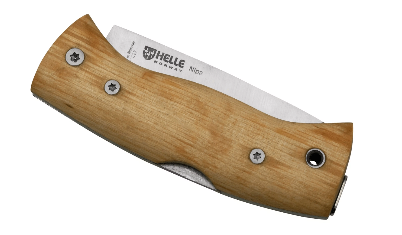 Eleganten skandinavski zložljivi nož HELLE Nipa za bushcraft, lov in vsakodnevno nošenje. Ponuja rezilo iz nerjavnega jekla 12C27 z gladkim robom, varen zaklep Backlock ter ergonomski ročaj iz kodraste breze s sponko in odprtino za vrvico.