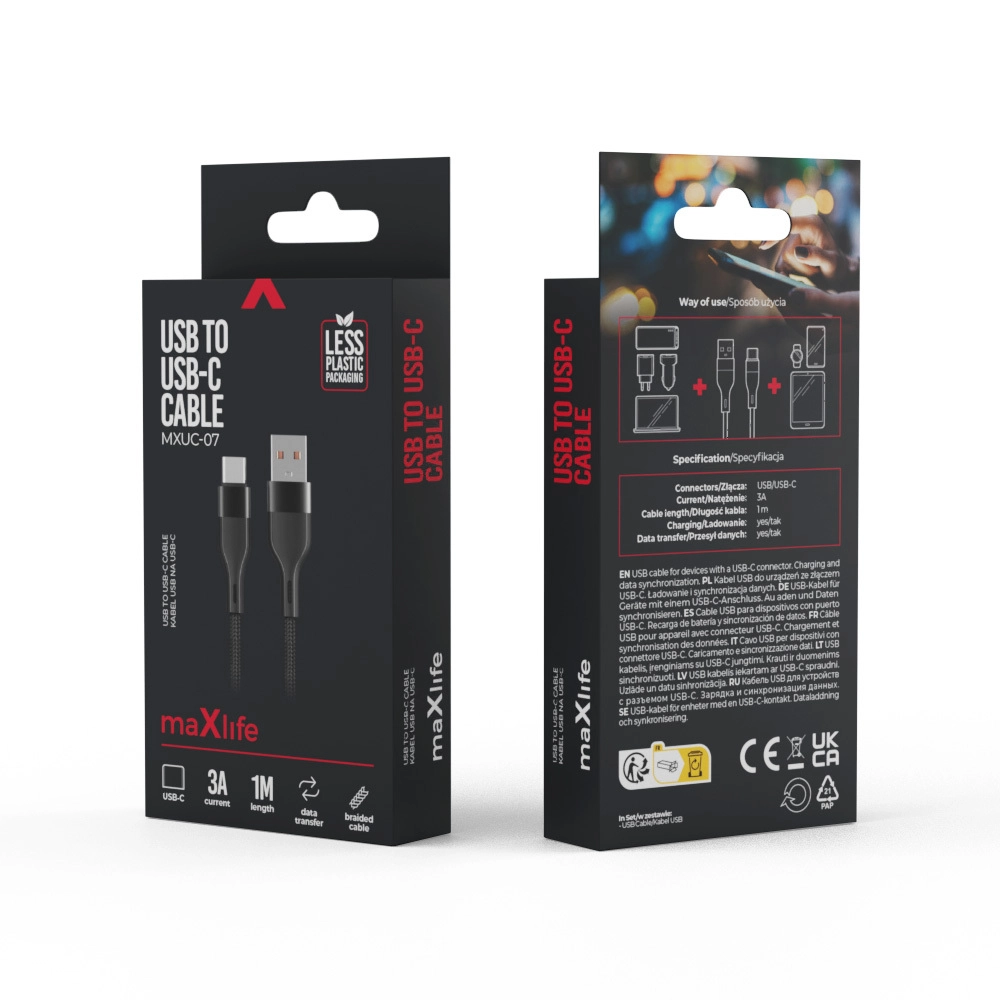 Praktični kabel Maxlife združuje preprostost in vzdržljivost. Najlonsko pletenje ščiti vodnike pred lomljenjem in obrabo, ojačani priključki pa zagotavljajo stabilno povezavo pri pogostem priklapljanju. S tokom do 3 A omogoča hitro polnjenje združljivih telefonov, tablic in drugih naprav z USB‑C priključkom.
