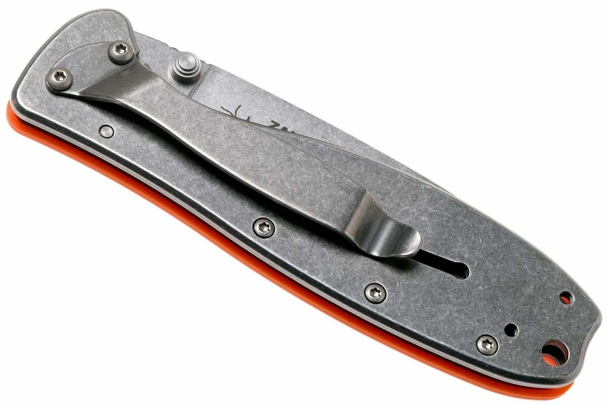 Teksturiran oranžen ročaj iz FRN zagotavlja zanesljiv oprijem tudi z rokavicami, nizka masa pa navduši pri EDC nošenju. Praktična žepna sponka je nastavljiva v dveh položajih, odprtina za vrvico pa širi možnosti pritrditve.