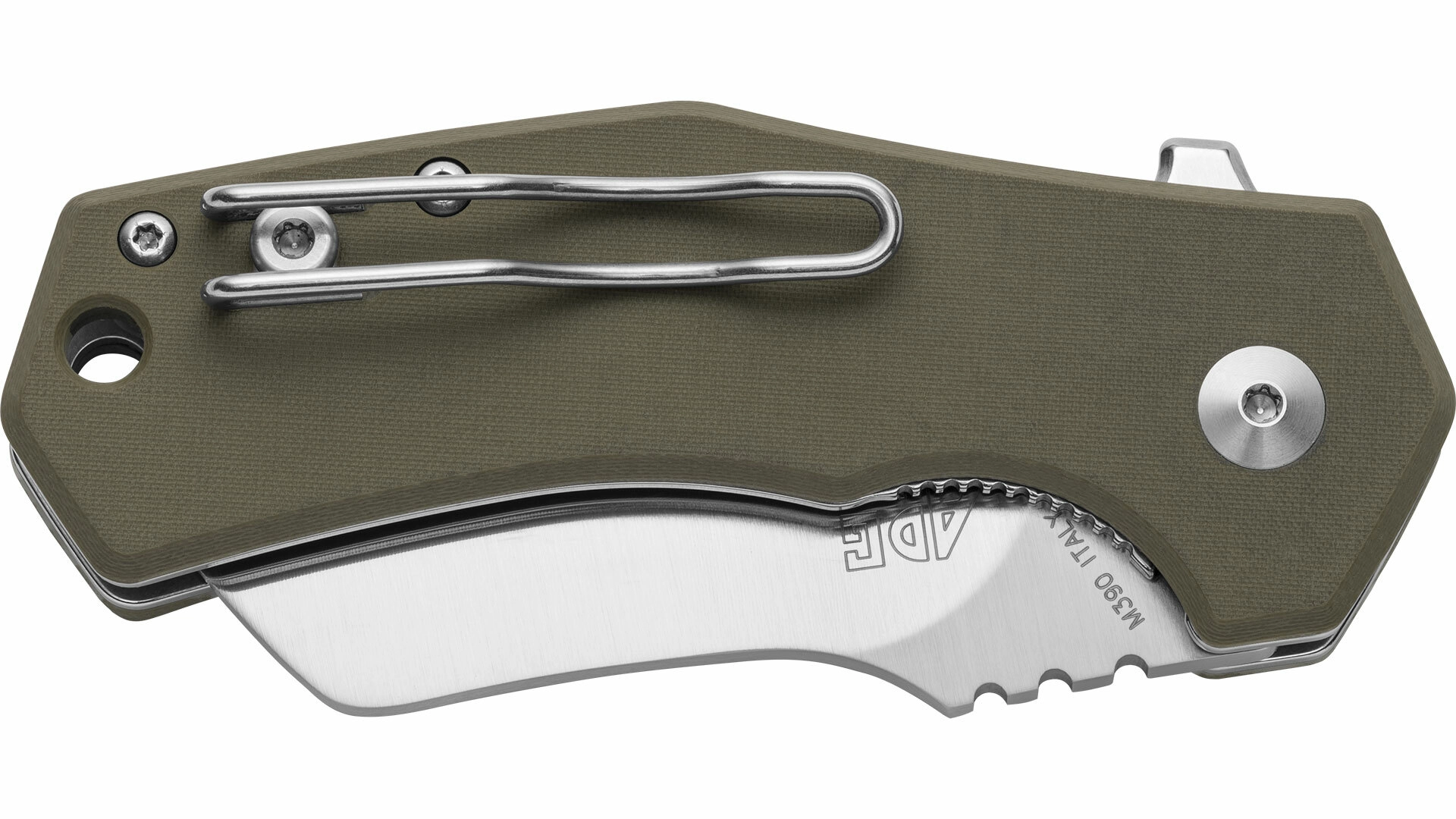 Rezilo tipa Sheepsfoot iz vrhunskega nerjavnega jekla Böhler M390 s satenskim zaključkom odlikujeta odličen obstoj ostrine in odpornost proti koroziji. Flipper omogoča hitro in gladko odpiranje z eno roko, medtem ko varovalo Liner Lock zagotavlja varnost pri delu. Teksturiran ročaj iz G10 v zeleni izvedbi trdno leži v roki in nudi visoko odpornost tudi v zahtevnejših pogojih. Priročna žepna sponka in odprtina za vrvico olajšata nošenje in prilagoditev opremi.