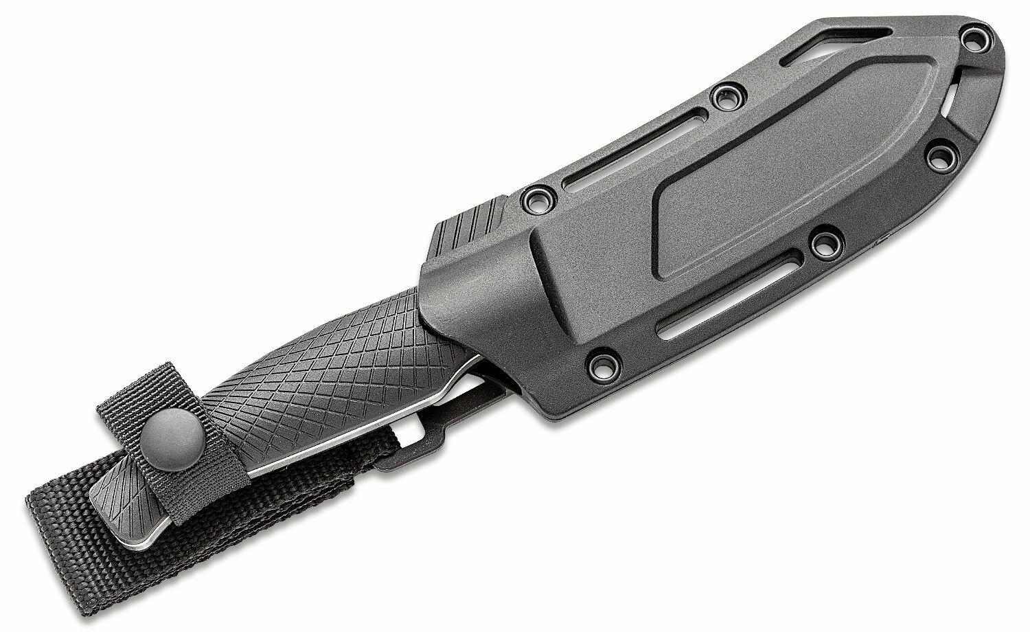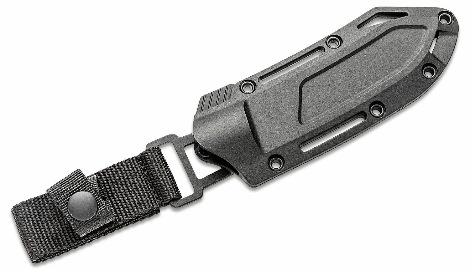 Ergonomski ročaj iz FRN s precizno rezkano teksturo zagotavlja zanesljiv oprijem tudi mokrih rok ali v rokavicah. Oblikovan FRN tok z več možnostmi pritrditve in najlonsko zaporo varno fiksira nož ter omogoča udobno in varno nošenje na terenu.