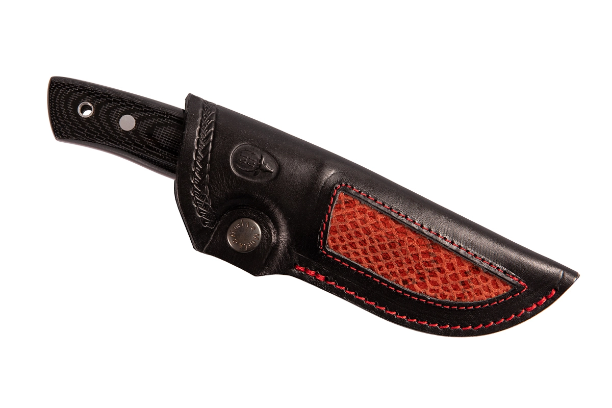 Ergonomski ročaj iz Micarte v črni barvi z elegantno rdečo linijo nudi zanesljiv oprijem tudi v mokrem. Uho za vrvico olajša zavarovanje ali obešanje. Del paketa je okrašen usnjeni etui z zanko za pas, ki zagotavlja varno nošenje in hiter dostop do noža. Dobavljeno v darilni škatli – idealno tudi kot reprezentativno darilo.