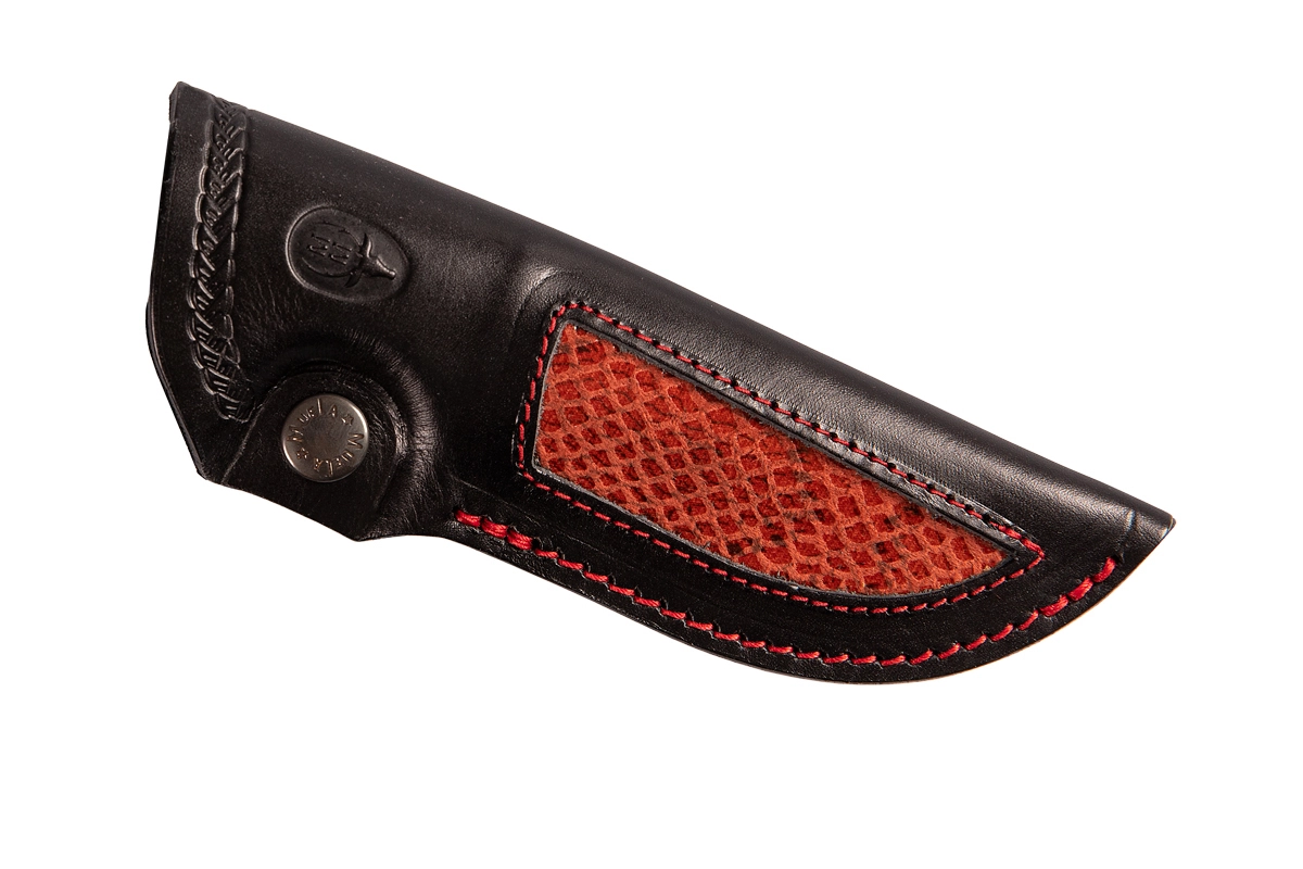 Okrašen usnjeni etui s trdnim patentnim zapiranjem in možnostjo pritrditve na pas ščiti nož med prenašanjem in omogoča hiter dostop.