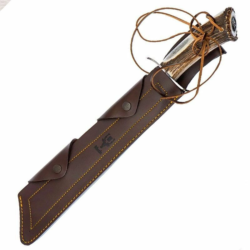 Vrhunski ročaj iz naravne jelenove rogovine daje nožu značaj in zanesljiv oprijem tudi v zahtevnih razmerah. Zaključek z rozeto in vstavljenim kovinskim graviranim lovskim motivom poudarja edinstven videz. Priloženo usnjeno etui omogoča udobno in varno nošenje na pasu.