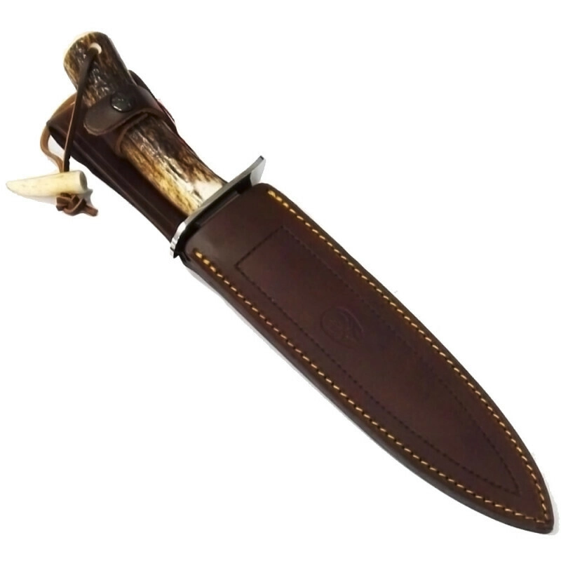 Tradicionalni ročaj iz jelenovega roga nudi čvrst in udoben oprijem, hkrati pa daje nožu reprezentativen videz, primeren tudi za slovesne namene (pasovalni tesak). Del paketa je rjav usnjeni etui za varno shranjevanje in nošenje.