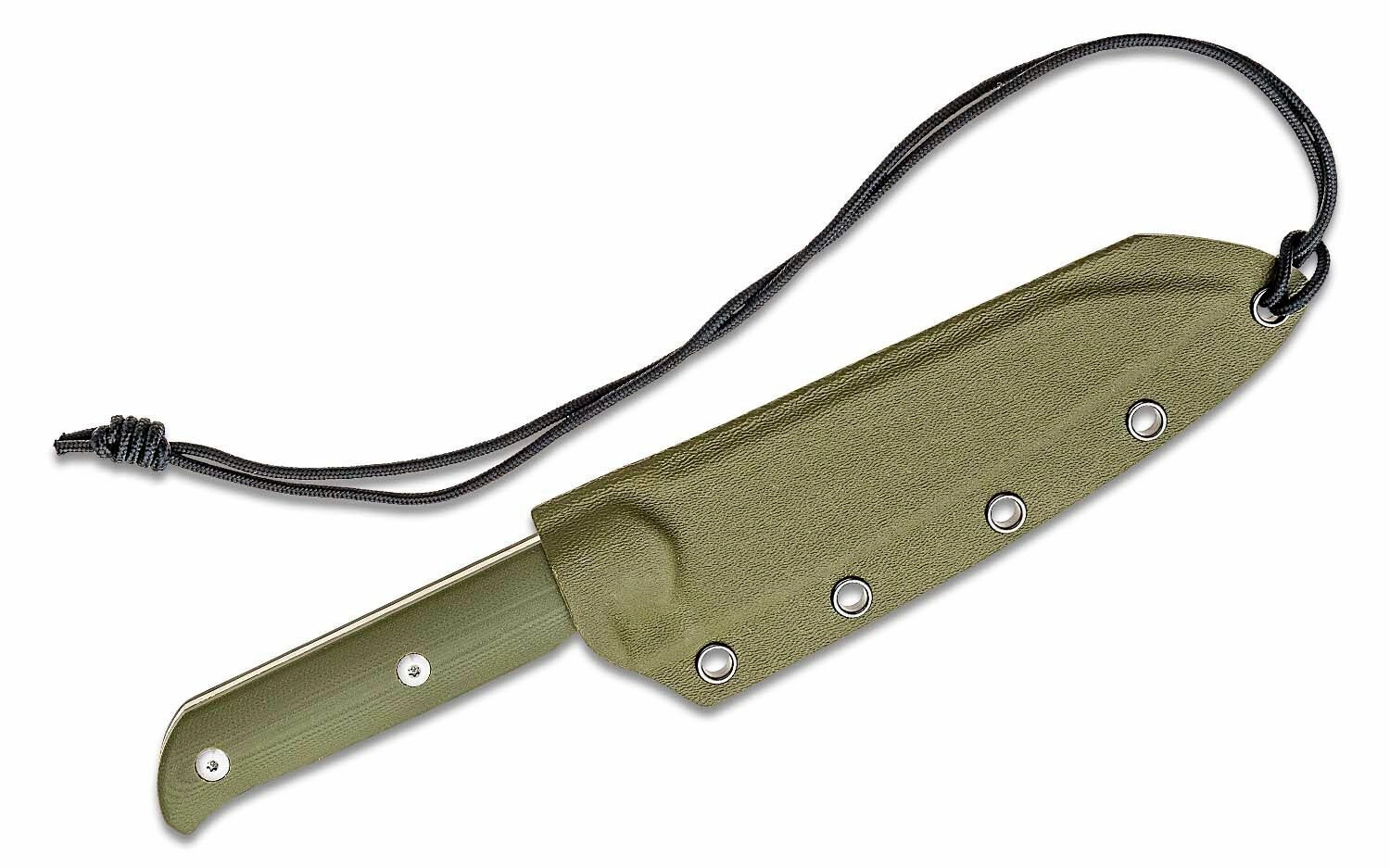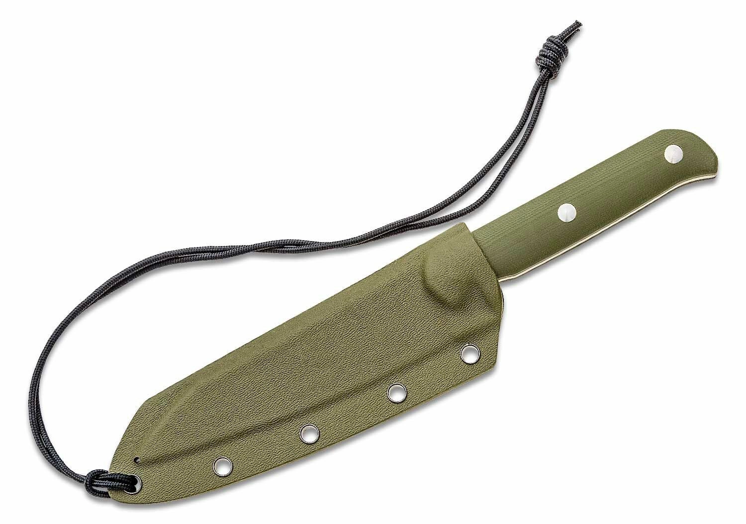 Ergonomski ročaj iz G10 v zeleni barvi je trdno pritrjen s tremi nerjavnimi zakovicami ter zagotavlja zanesljiv oprijem tudi v zahtevnih pogojih. Del paketa je etuí Kydex z več točkami za pritrditev in vrvica za udobno obešanje ali prenašanje.