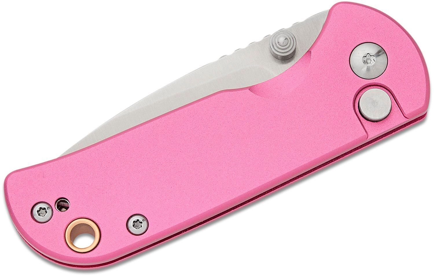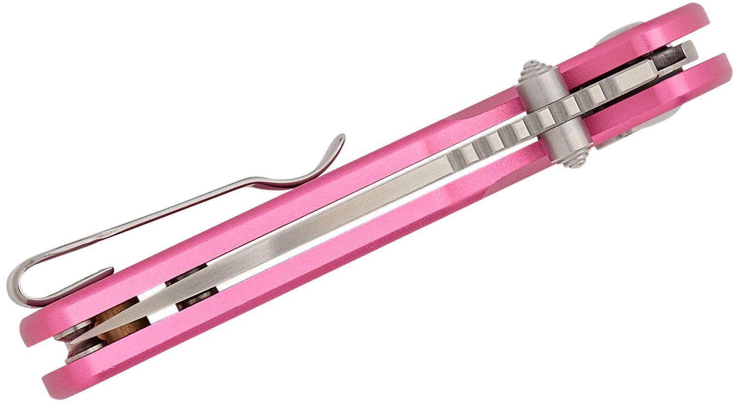 Keramična kroglična ležaja in dvostranski palčni zatič omogočata hitro, tekoče odpiranje z eno roko. Po odprtju rezilo zanesljivo zavaruje ključavnica Button Lock. Lahek aluminijast ročaj v rožnati barvi je trpežen, dobro leži v roki in je zahvaljujoč sponki ter odprtini za vrvico idealen za EDC nošenje.