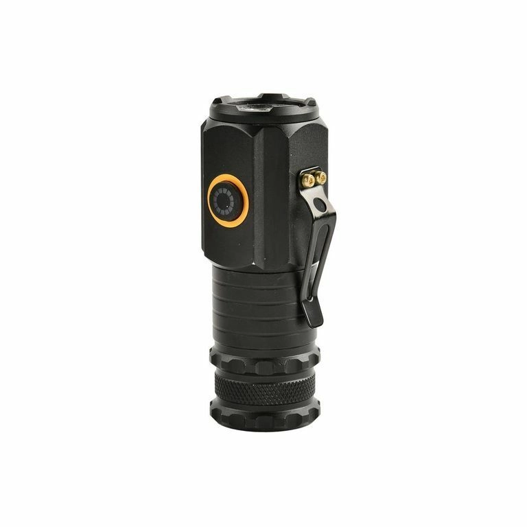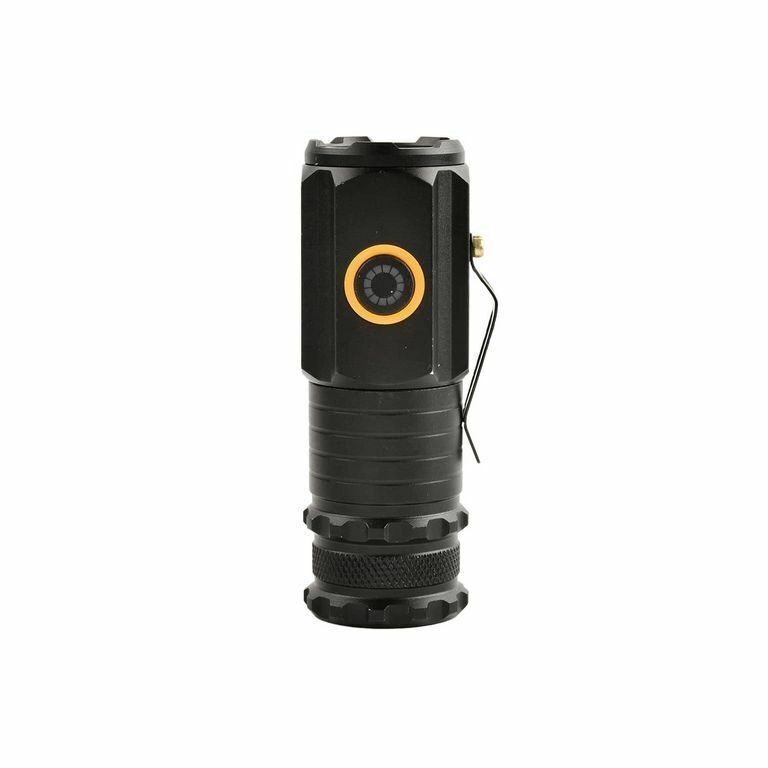 Upravljanje je preprosto z bočnim gumbom: hitro preklapljanje med visoka–srednja–nizka svetilnost, stroboskop z dolgim pritiskom in turbo z dvojnim pritiskom. Napajanje zagotavlja priložena 18350 (1100 mAh) z polnjenjem prek USB‑C, indikator polnjenja sveti rdeče. Za maksimalno praktičnost sta tu magnetno dno in aluminijasta sponka.