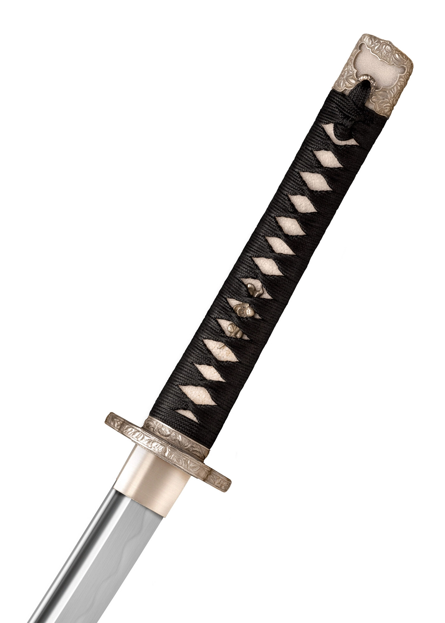 Ročaj s tradicionalno ovitko iz črne svilnate vrvice preko prave ray skin (same) in menuki nudi udobje, nadzor in avtentičen videz.
