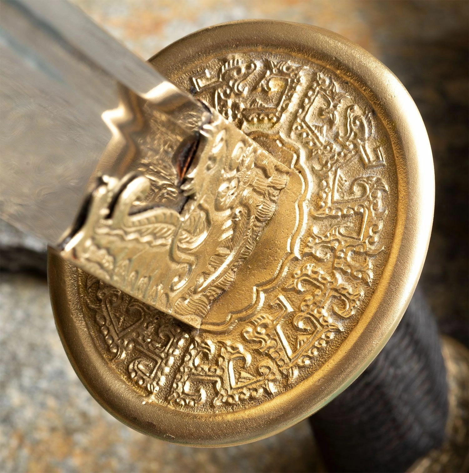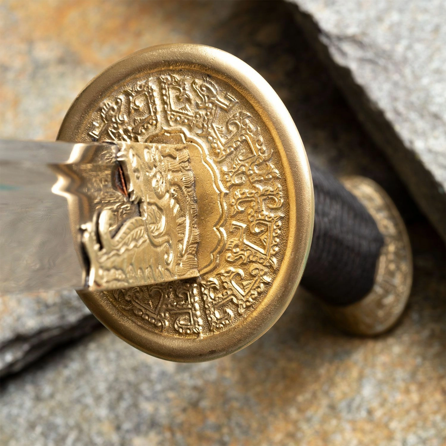 Ornamentalna medeninasta zaščita z zmajevim motivom ter črno svilnato opletenje ročaja zagotavljata zanesljiv oprijem in impresiven videz.