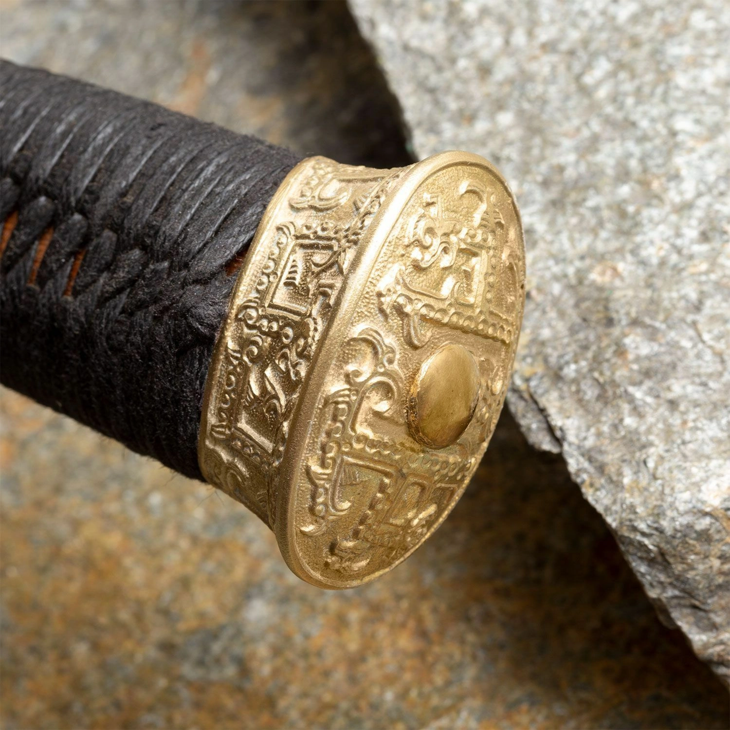 Ročaj združuje funkcionalnost in estetiko: okrogla medeninasta zaščita s klasičnim graviranim ornamentom ščiti roko in hkrati poudarja zgodovinski značaj. Jedro iz trdega lesa je čvrsto in stabilno, medtem ko črno svilnato opletenje zagotavlja zanesljiv in udoben oprijem. Medeninast gumb pomaga pri uravnoteženju celotnega orožja.