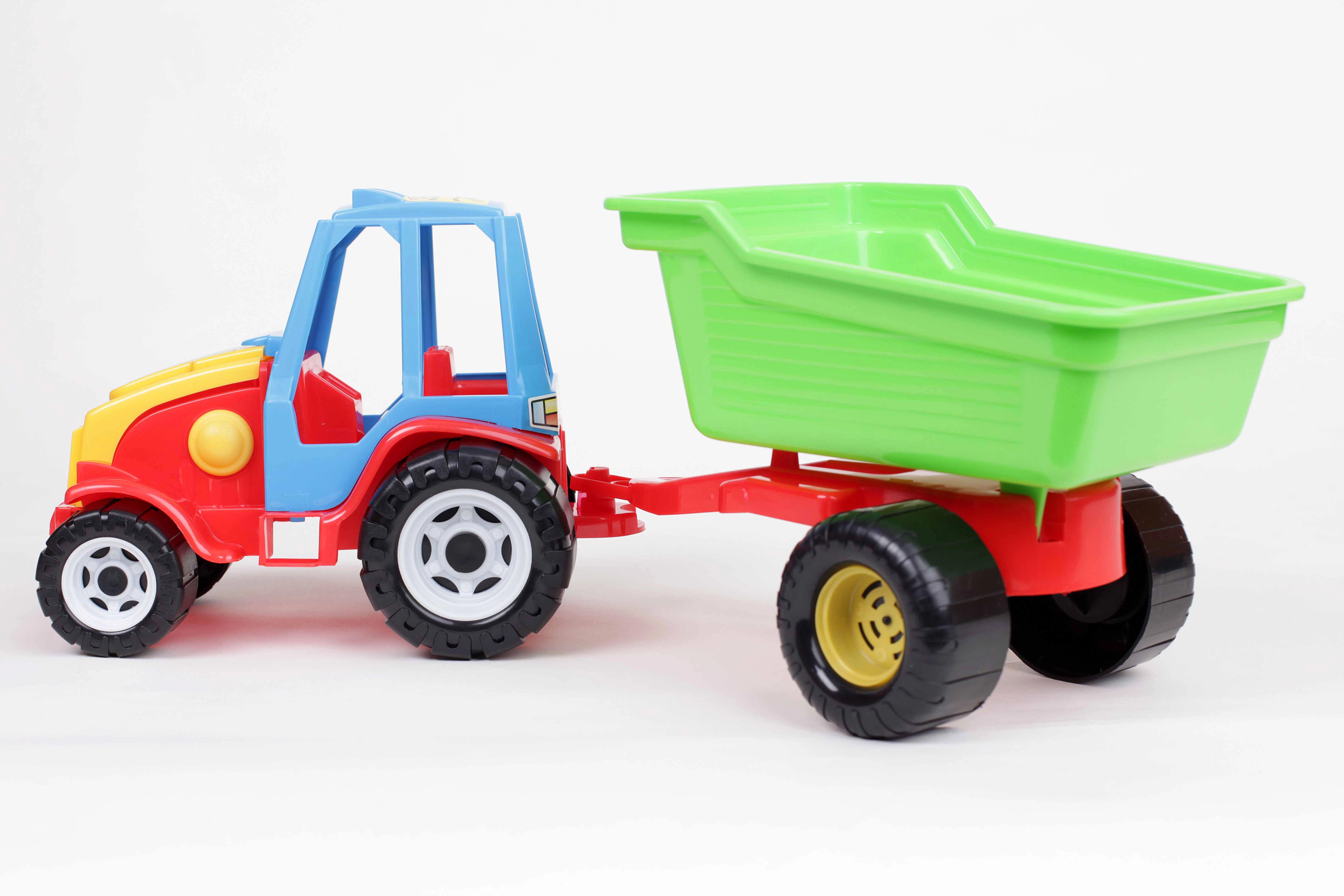 Odkrijte zabavo s stabilnim plastičnim traktorjem z enoosnim priklopnikom, ki ga je mogoče preprosto odklopiti in nagniti nazaj. Velika črna kolesa zagotavljajo gladko vožnjo po tleh in v pesku, barvita izvedba pa vabi k vsakodnevni igri. Igrača je izdelana iz kakovostnih in varnih materialov, ki ne vsebujejo spojin težkih kovin.