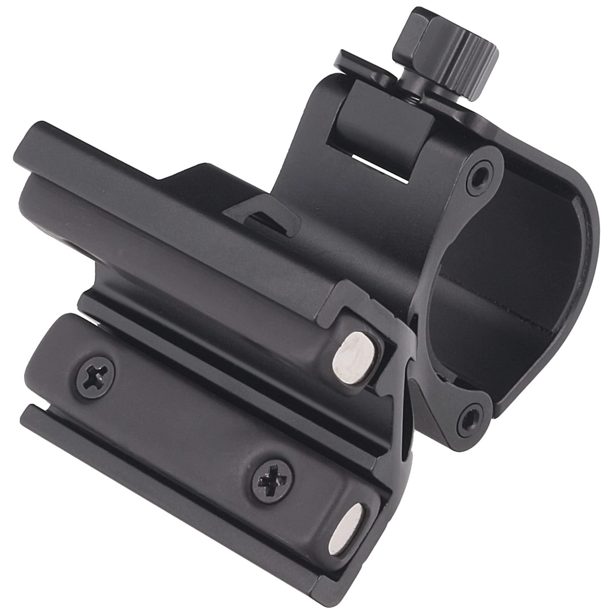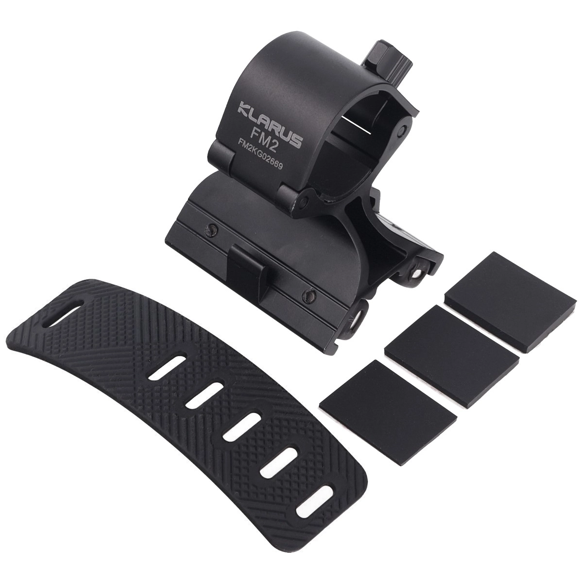 Nosilec Klarus FM2 je zasnovan za hitro in varno namestitev svetilke na cev orožja. Močni magneti v kombinaciji s silikonskim trakom zagotavljajo, da svetilka ostane trdno na mestu, medtem ko kakovostne silikonske podložke blažijo tresljaje in preprečujejo neželeno zasukanje montaže. Robusten dizajn iz eloksirane aluminijeve zlitine Mil‑Spec HAIII zagotavlja visoko odpornost v zahtevnih pogojih.