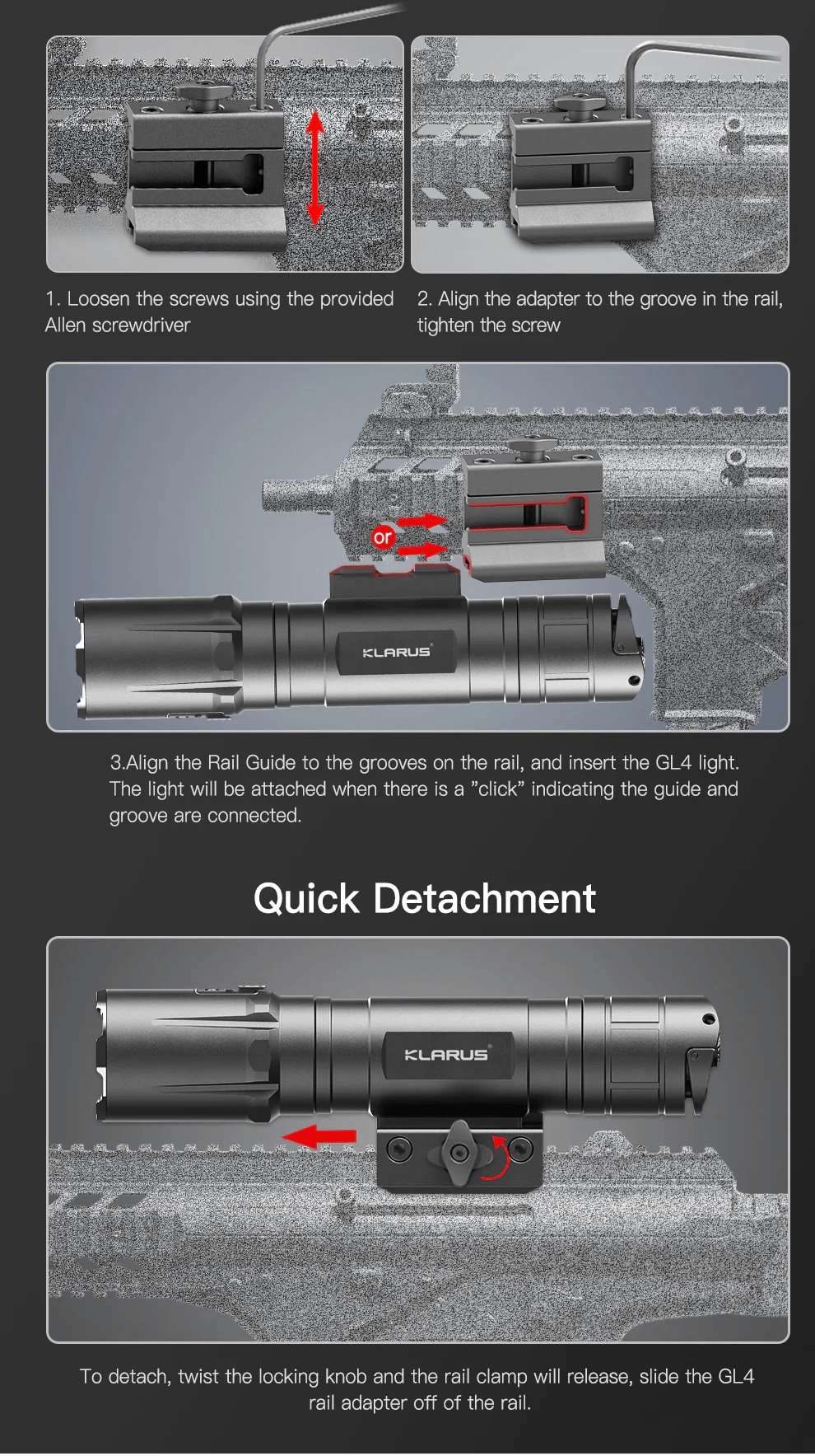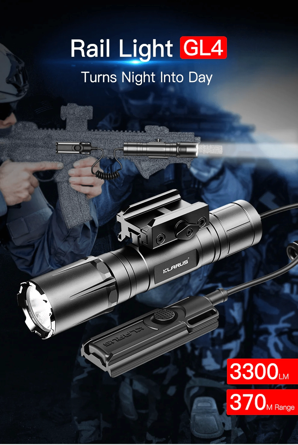 Klarus GL4 je robustna taktična LED svetilka, zasnovana za montažo na orožje in zahtevno uporabo na prostem. Zaradi diode Luminus in poliranega reflektorja nudi hladno belo svetlobo 6500K, 3300 lumnov in doseg do 370 metrov. Dvojna taktična/outdoor nastavitev in dvojno stikalo omogočata bliskovit dostop do TURBO in stroboskopa.