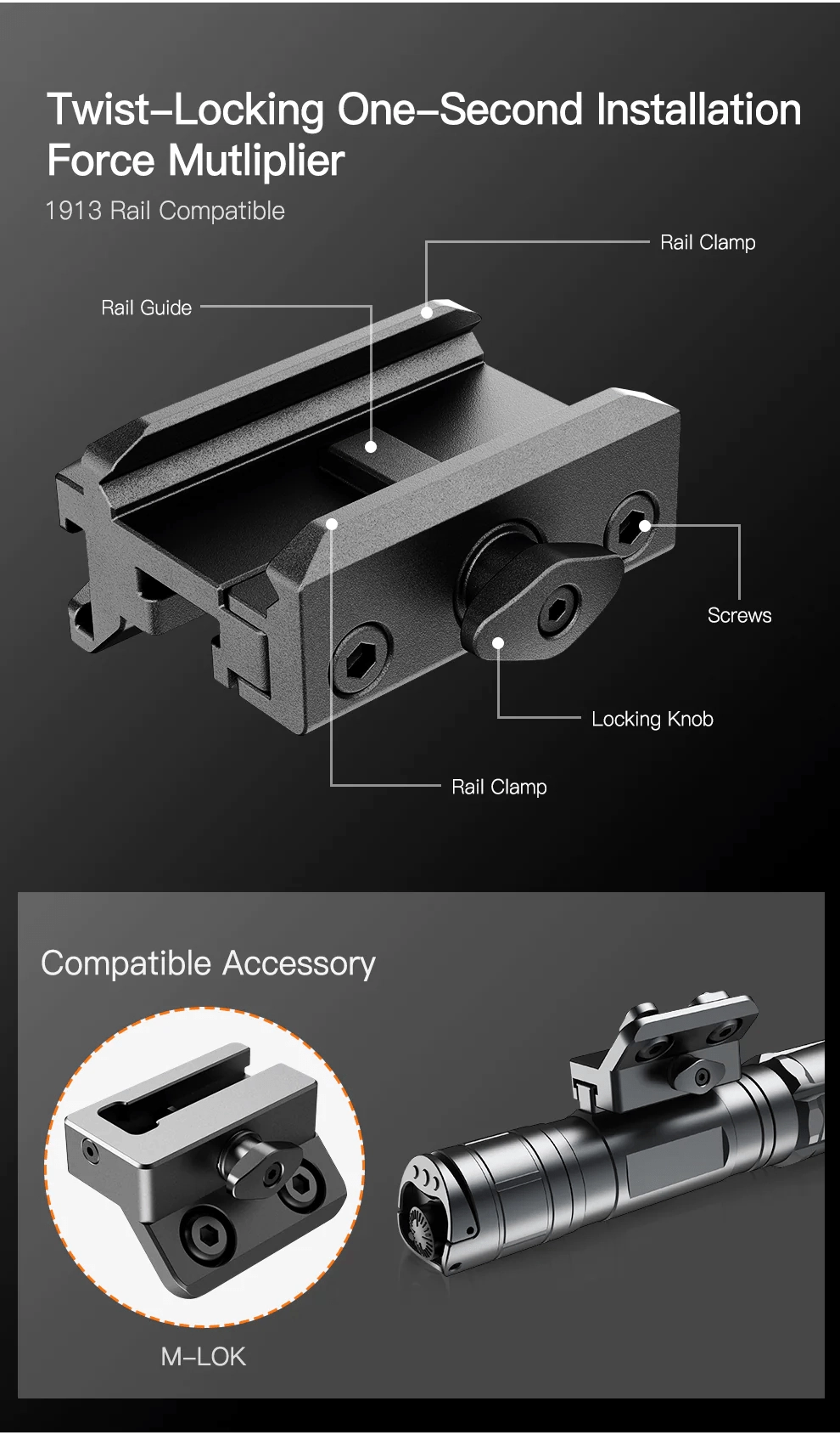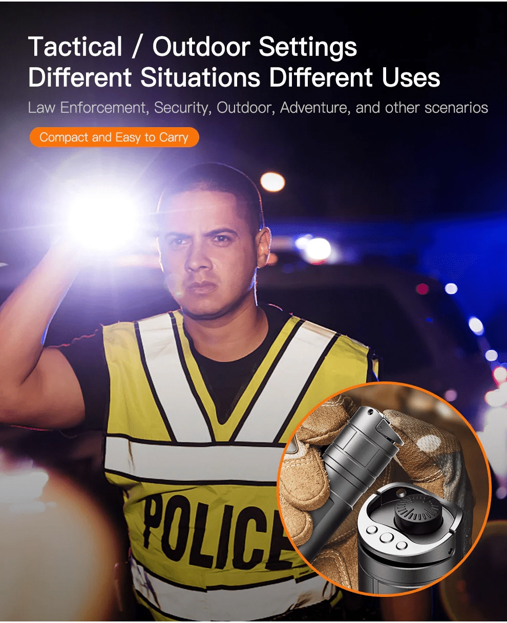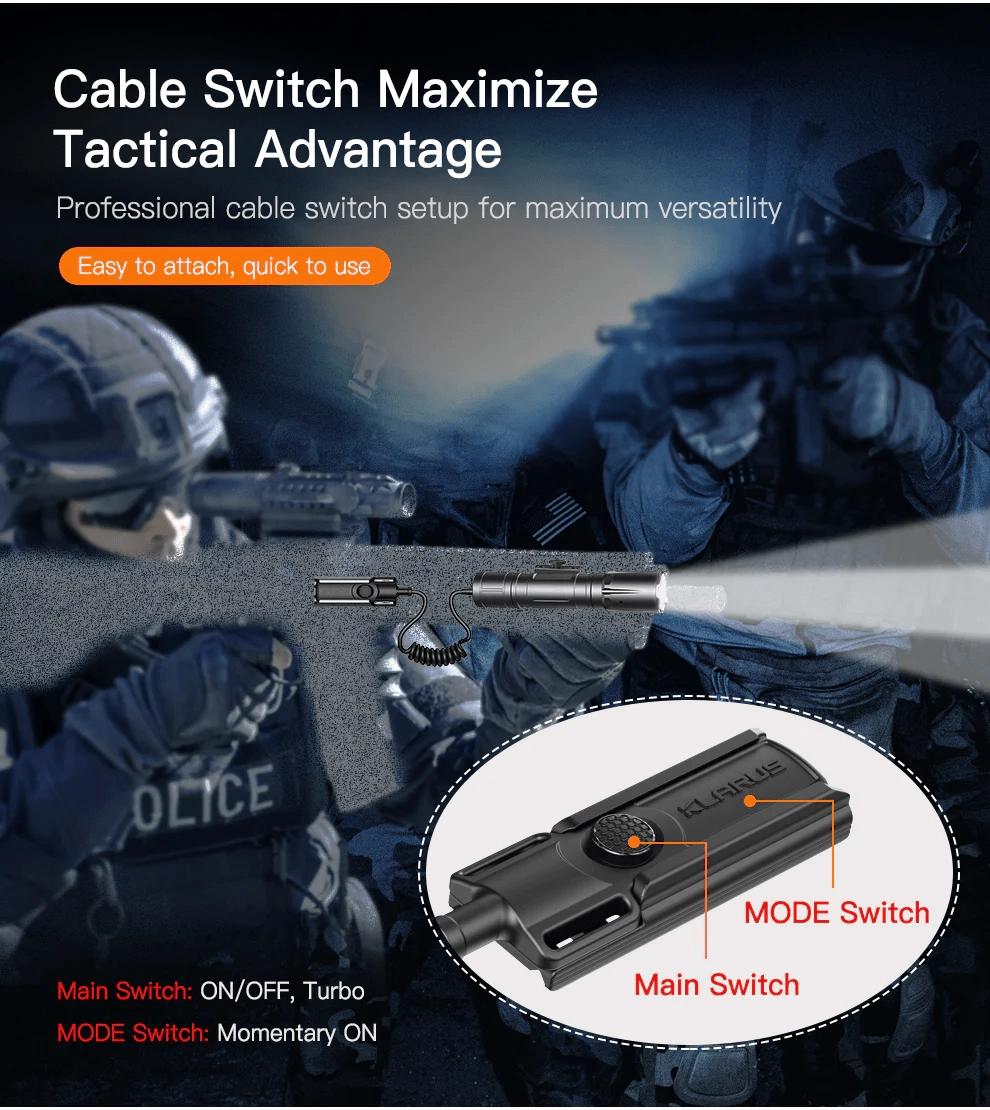 Napajanje z visokotokovnim akumulatorjem 21700 5000 mAh (15 A) prinaša do 375 ur delovanja in udobno polnjenje prek USB‑C. Hitro-sneljni vmesnik za Picatinny letev zagotavlja varno pritrditev tudi z rokavicami in v popolni temi. V paketu je daljinsko žično stikalo z glavnim okroglim gumbom (vkl./izkl., TURBO s stalno svetlobo) in podolgovatim gumbom za načine (trenutno upravljanje).
