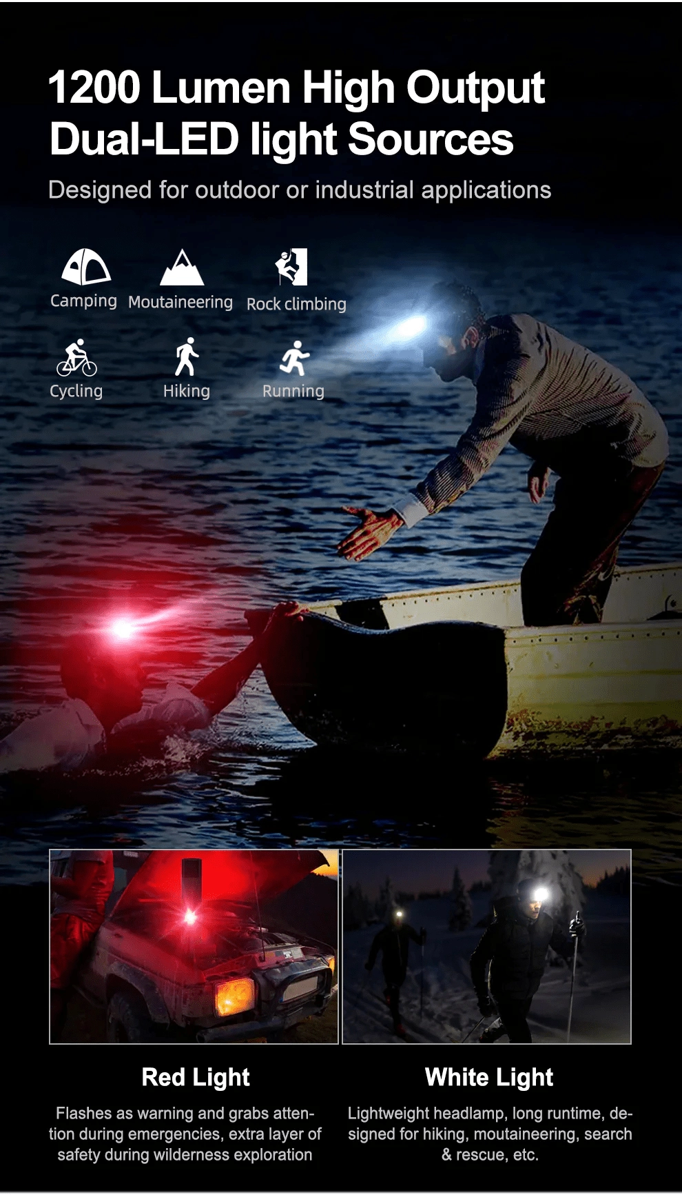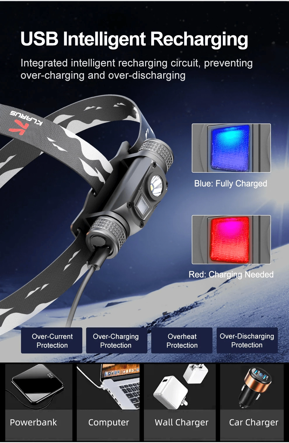 Zahvaljujoč pametnemu USB polnjenju z zaščito pred prenapolnitvijo in preizpraznitvijo je delovanje varno in zanesljivo. Ohišje iz kaljenega letalskega aluminija 6061‑T6 je odporno na vodo po standardu IPX6 in na padce z višine 1 m. Svetilko je mogoče zlahka sneti z naglavnega traku in uporabiti kot namizno svetilko.