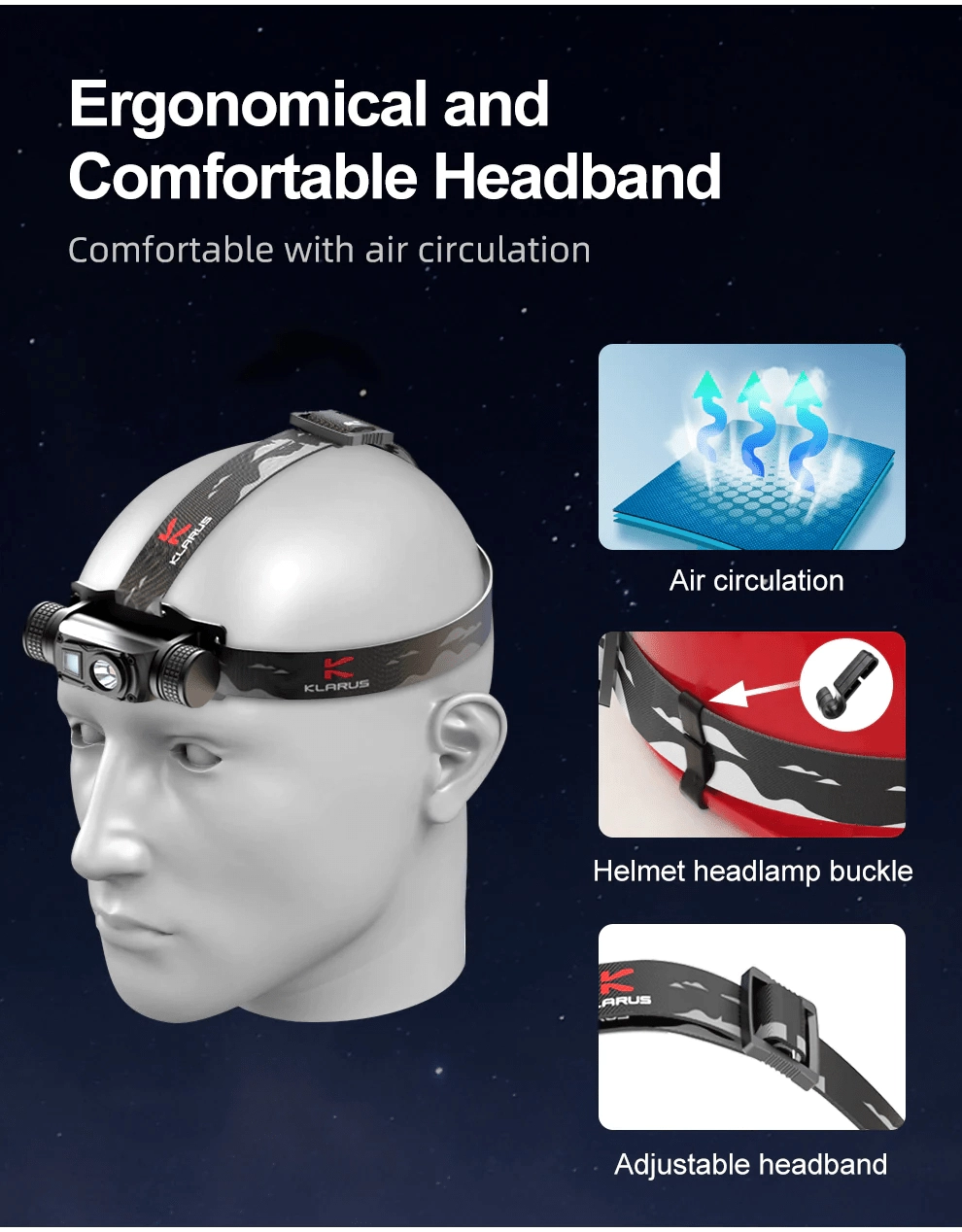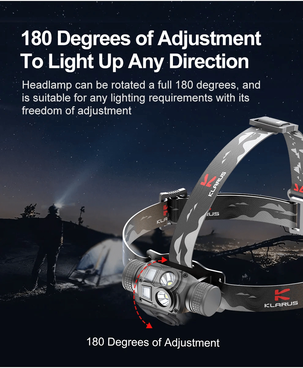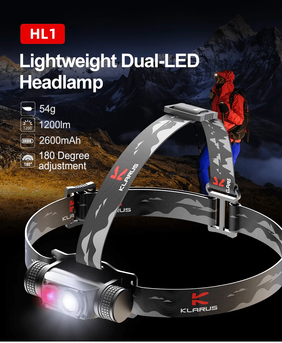 Lahka in trpežna naglavna svetilka Klarus HL1 z močjo 1200 lm in dosegom 125 m združuje točkast in širok snop, omogoča nastavitev kota 180° ter ponuja 3 svetlobne vire, vključno z rdečo LED za diskretno osvetlitev. Zahvaljujoč USB polnjenju in bateriji 18650 2600 mAh deluje do 100 ur. Primerna za kampiranje, pohodništvo, kolesarjenje in tek.