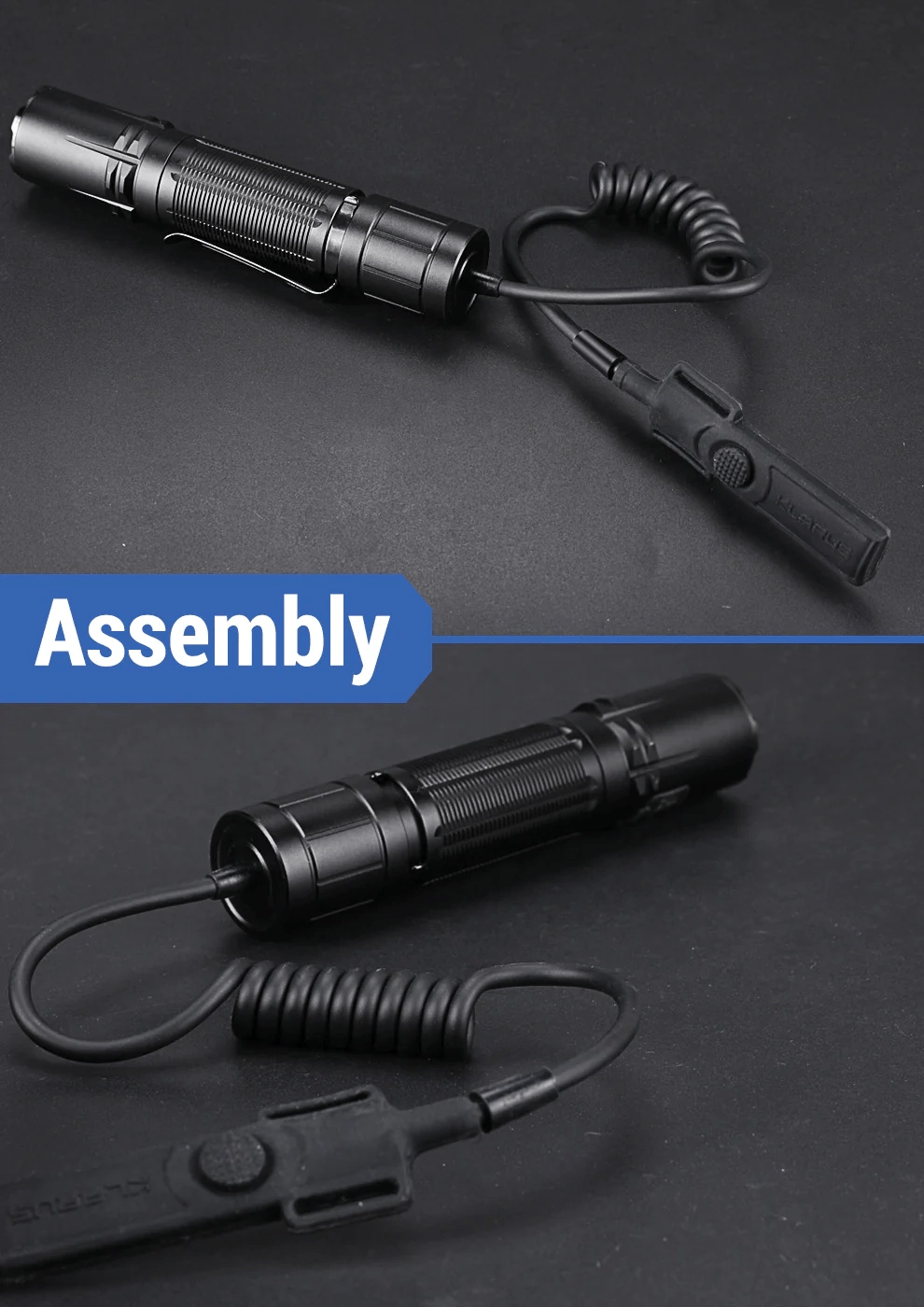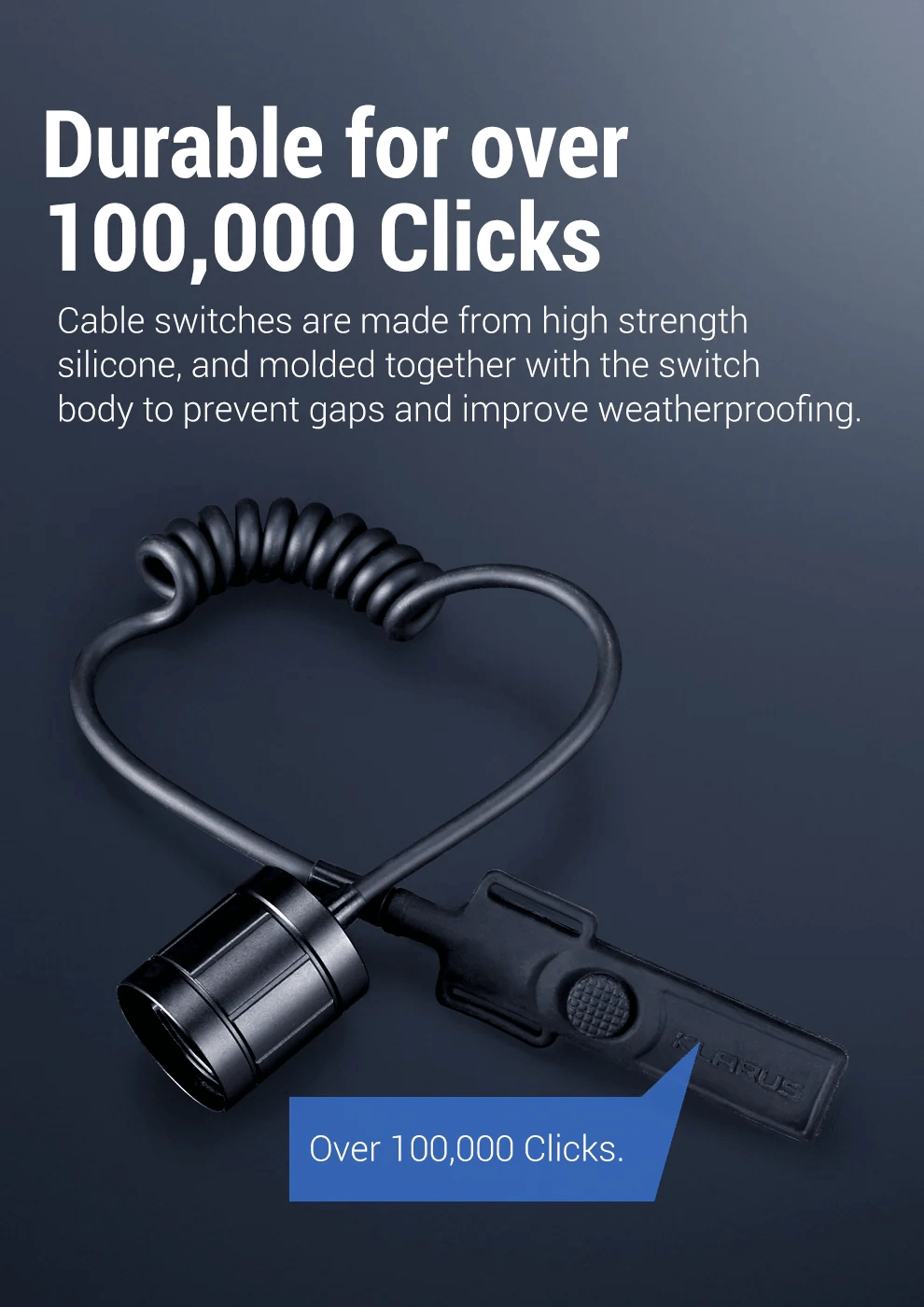 Stikalo je zasnovano z poudarkom na vzdržljivosti in zanesljivosti. Visokotrdnostni spiralni PU kabel se prožno prilagaja različnim dolžinam (pribl. 30–50 cm) in taktičnim prijemom. Silikonski gumbi so vtisnjeni neposredno v ohišje stikala, s čimer se zmanjšajo reže in poveča odpornost proti vremenskim vplivom. Življenjska doba do 100.000 klikov zagotavlja dolgotrajno brezskrbno uporabo.