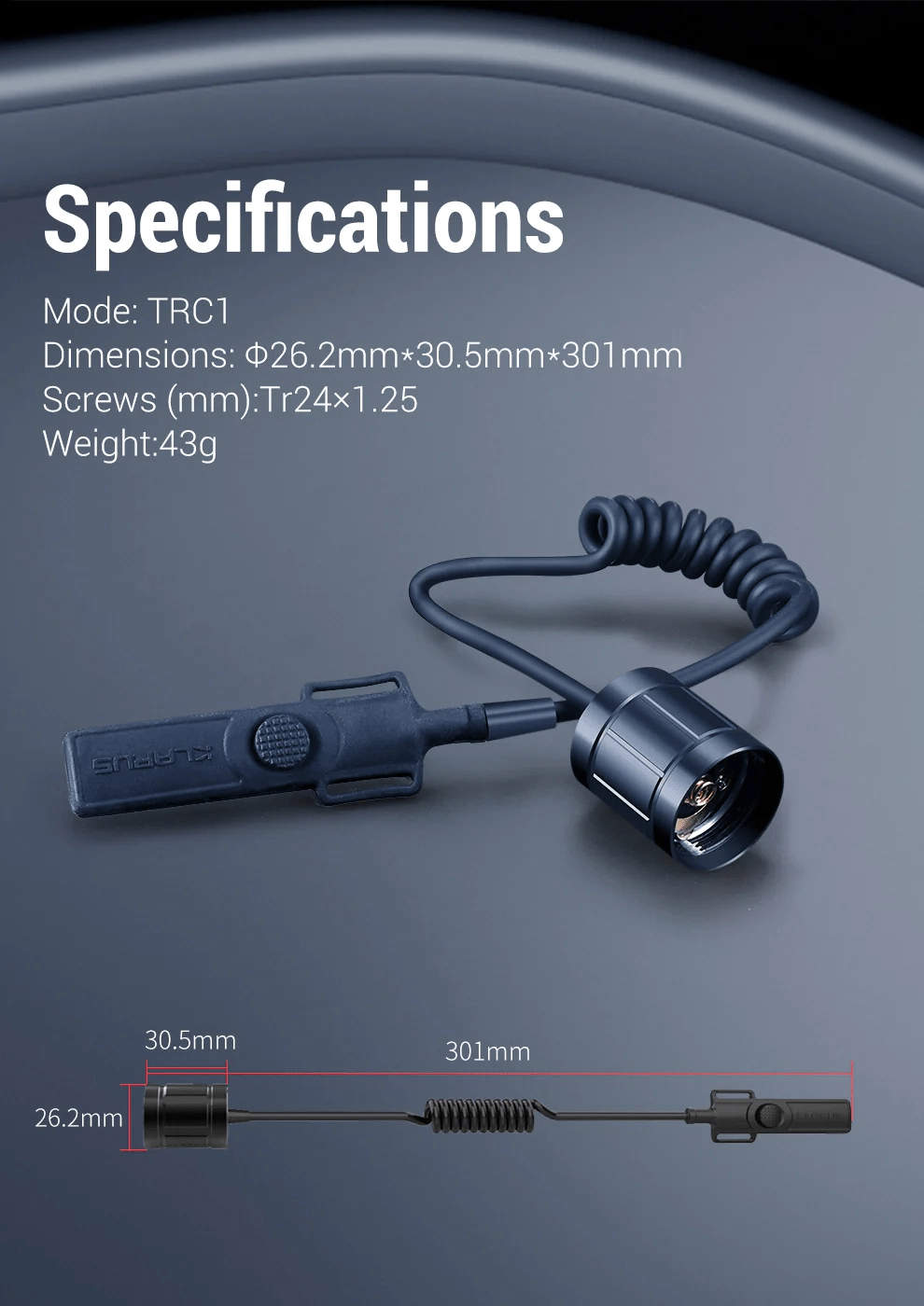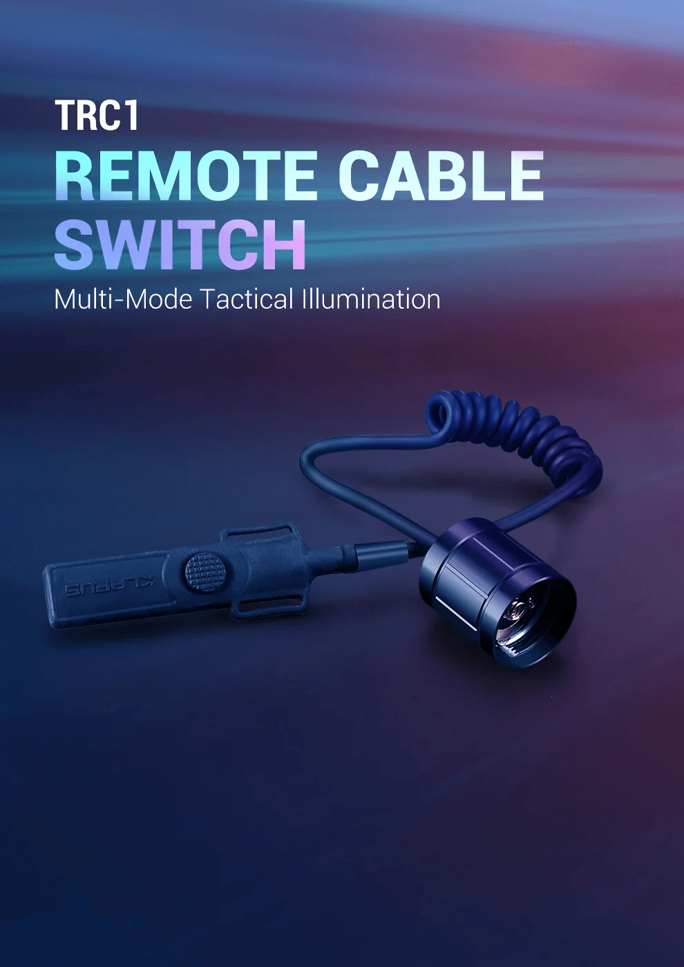 Daljinski kabelski stikalo Klarus TRC1 ponuja hitro in zanesljivo upravljanje tako taktično kot na terenu. Ima dve ločeni tipki – okrogli gumb za takojšnjo 100% svetlobo (trenutno ali stalno) in podolgovat gumb za takojšnji STROBE. Združljiv s svetilkami XT11GT PRO V2 in XT2CR PRO, z odpornim PU kablom in življenjsko dobo do 100.000 pritiskov.