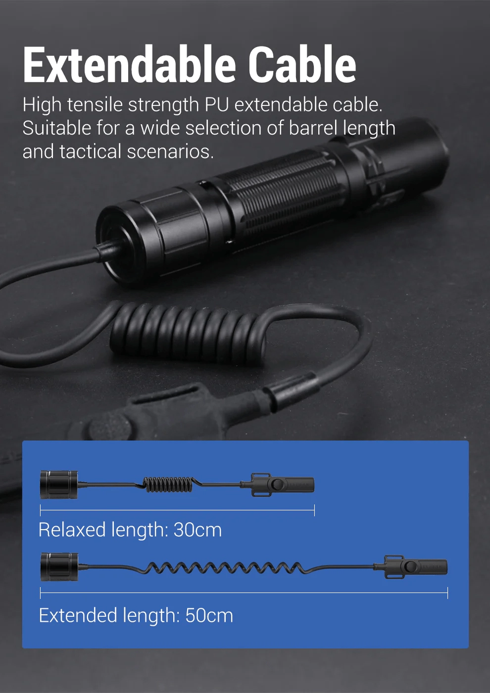- Taktična prilagodljivost – raztegljiv PU kabel za različne položaje namestitve.