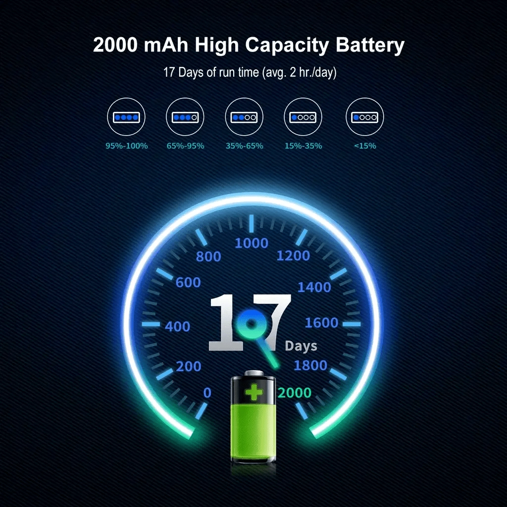 Vgrajena baterija 2000 mAh se polni preko micro‑USB (kabel je priložen). 4‑stopenjski indikator stanja napolnjenosti vas sproti obvešča. Avtonomija doseže do 35 ur v nizkem načinu in približno 2,5 ure pri visoki svetlosti po polnem polnjenju.
