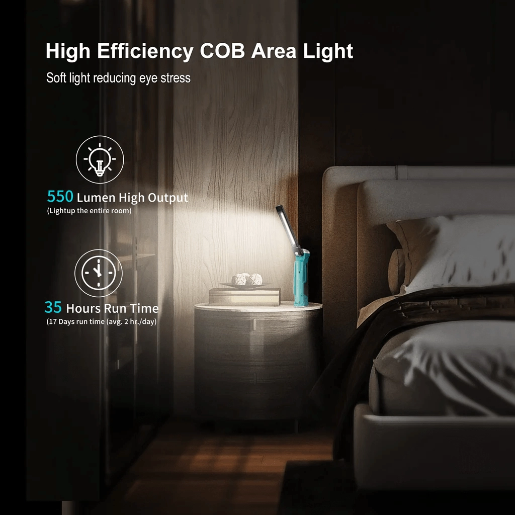 COB plošča zagotavlja do 550 lm z dosegom 31 m, sprednja LED ponuja dnevno belo svetlobo 80 lm z dosegom 12 m. Skupno je na voljo 7 načinov, vključno z belimi (nizek/srednji/visok) in rdečimi opozorilnimi (utripanje, stroboskop), plus 2 načina sprednje luči. Močan magnet v dnu in zadnja kljukica omogočata hitro pritrditev na kovinske površine ali obešanje.