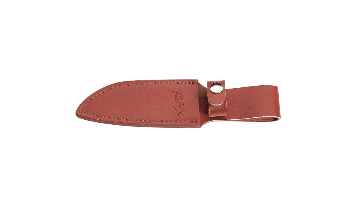 Ročaj iz palisandrovega lesa je ergonomsko oblikovan in opremljen z utori za zanesljiv in udoben oprijem. Integriran ščitnik povečuje varnost pri delu. Nož je dobavljen s kakovostno usnjeno tokovino za varno in stilsko nošenje na pasu.
