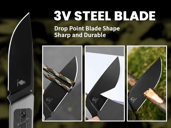 Črno površinsko obdelano rezilo iz orodnega jekla 3V ponuja odlično žilavost, odpornost proti obrabi in zanesljiv rez pri EDC in outdoor uporabi.