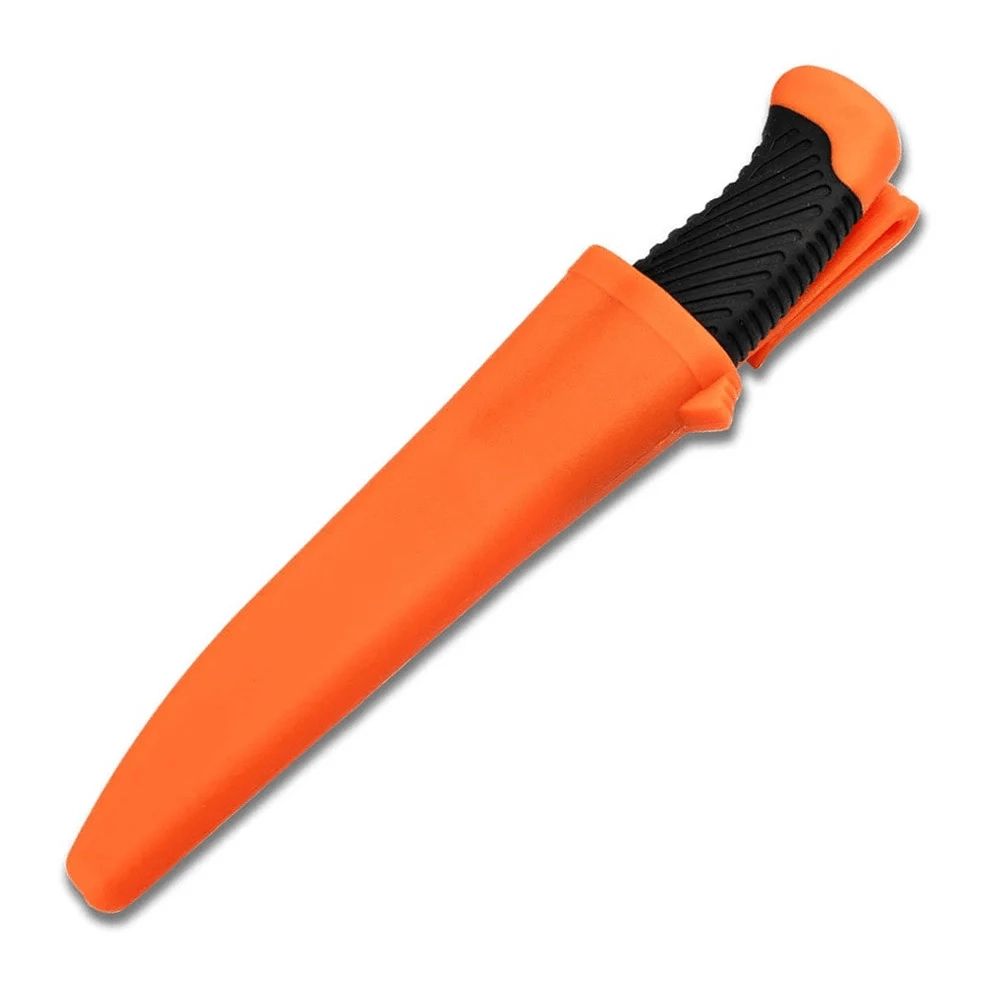 Oranžen ročaj s teksturiranim, protizdrsnim gumiranim premazom zagotavlja zanesljiv in udoben oprijem tudi v mokrem okolju. Vzdržljiva plastična nožnica je zaščitena pred predrtjem ali prerezom, ima integrirano sponko za enostavno pritrditev na pas in drenažno odprtino za odvajanje vlage.