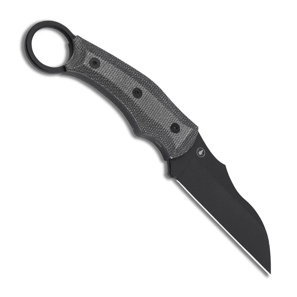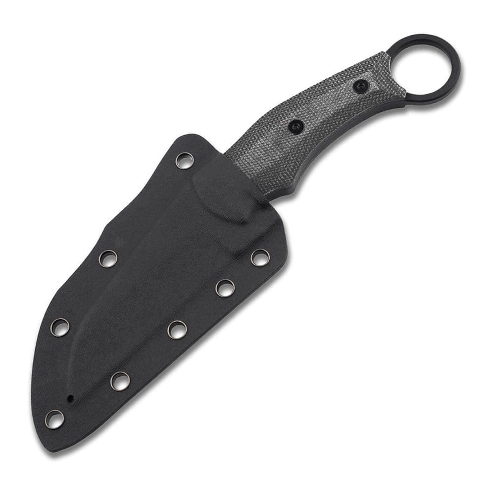 Ročaj iz črne Micarte je oblikovan za udoben in varen oprijem tudi v zahtevnih razmerah. Prstni obroč izboljšuje nadzor in hkrati služi kot odprtina za vrvico. Kydex nožnica s sponko omogoča diskretno in zanesljivo nošenje na pasu.