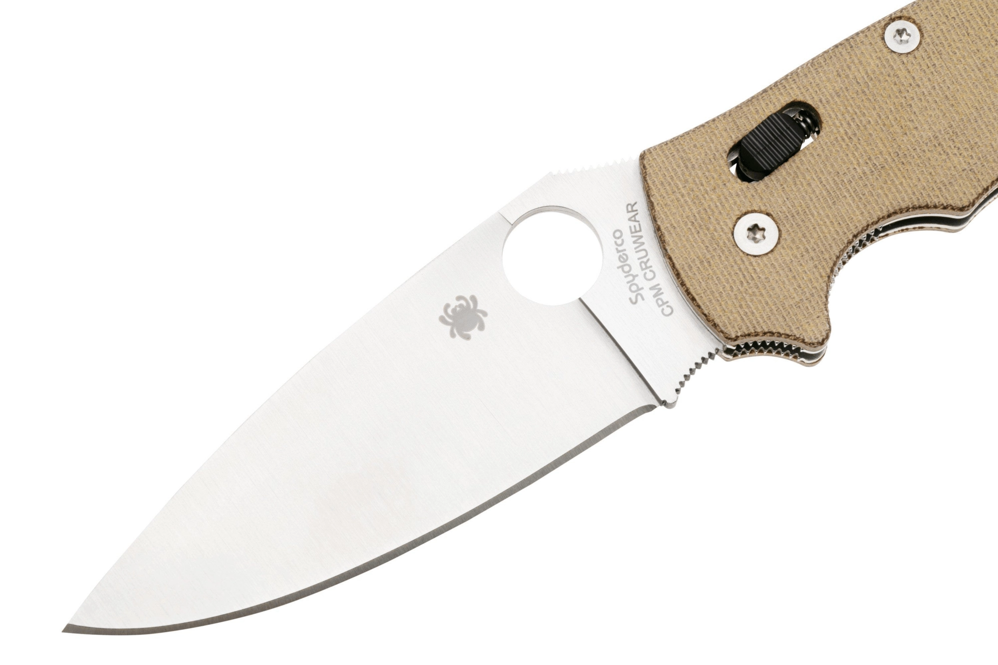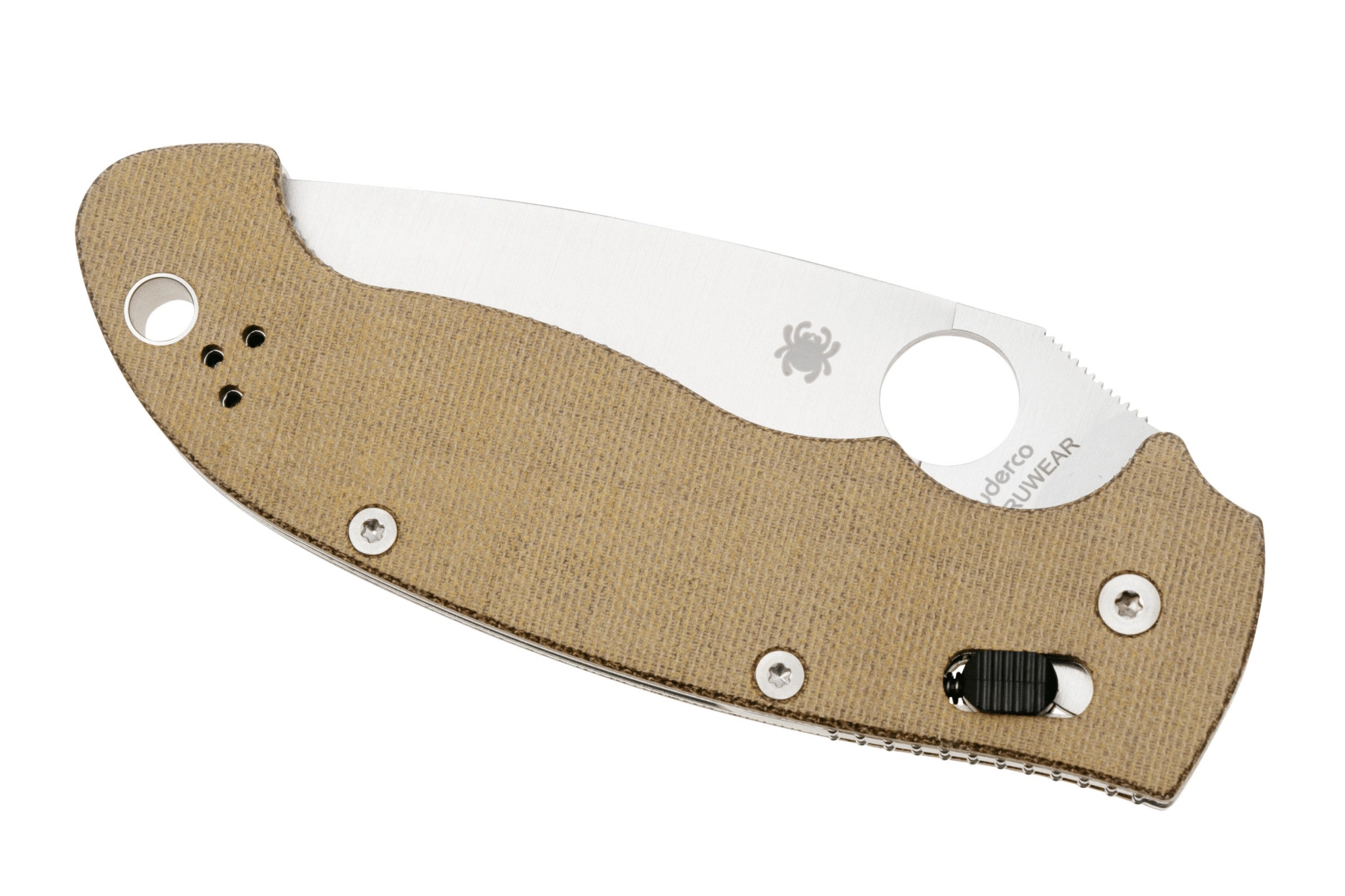 Patentirani SpyderHole omogoča hitro, obojestransko odpiranje, inovativni Spyderco Ball Bearing Lock pa prinaša izjemno trdnost in gladko delovanje, kar cenijo tako desničarji kot levičarji. Ročaji iz Canvas Micarta v rjavi barvi so prijetno teksturirani, lahki in zelo trpežni, vizualno privlačni ter varni v roki tudi v mokrem.