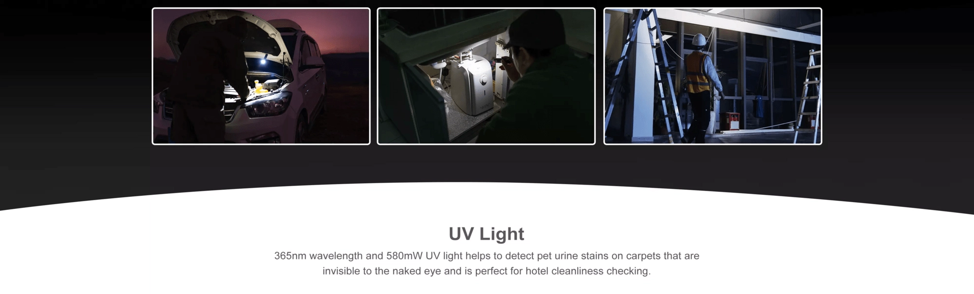 UV svetloba z močjo 580 mW je uporabna za preverjanje bankovcev, identifikacijo fluorescenčnih mineralov ali sledi onesnaženja v notranjih prostorih. Praktična oprema vključuje dvosmerno žepno sponko z ušescem za vrvico, magnetno osnovo za pritrditev na kovinske površine ter preprosto upravljanje z osrednjim gumbom in izbirnikom. Polnjenje prek magnetnega USB kabla MCC1A je hitro in udobno.