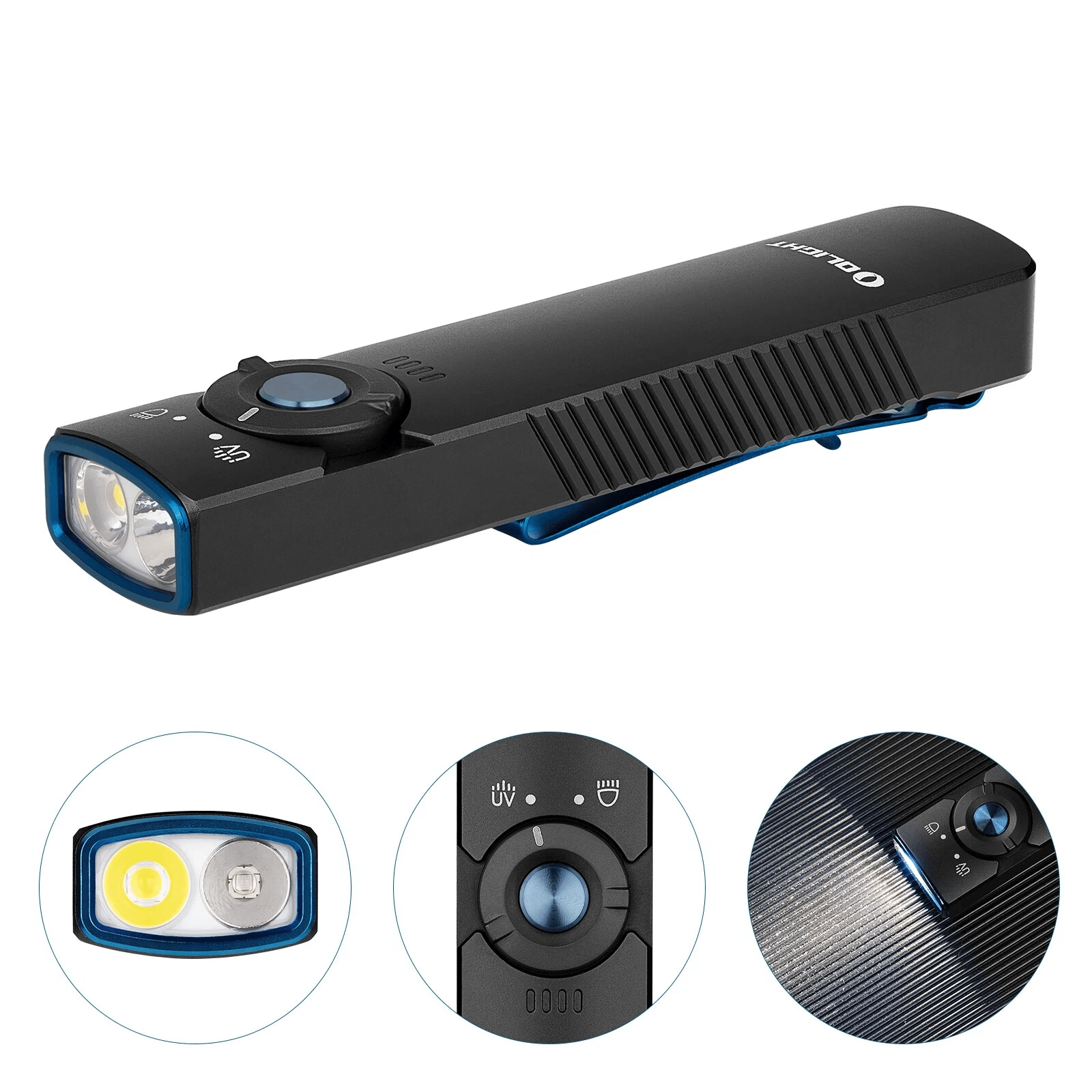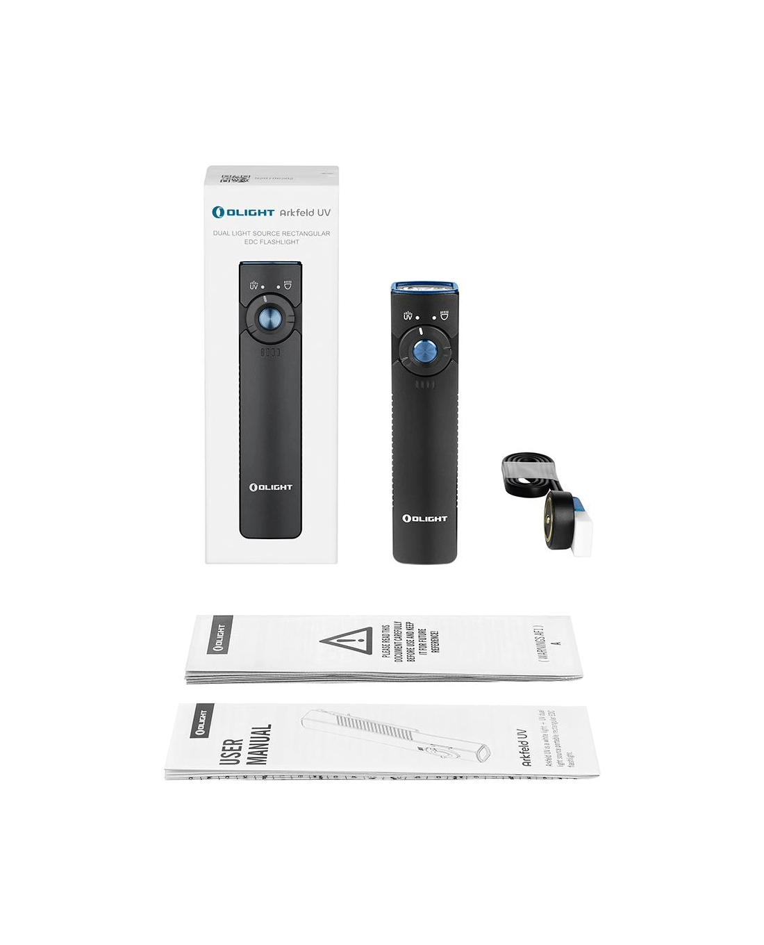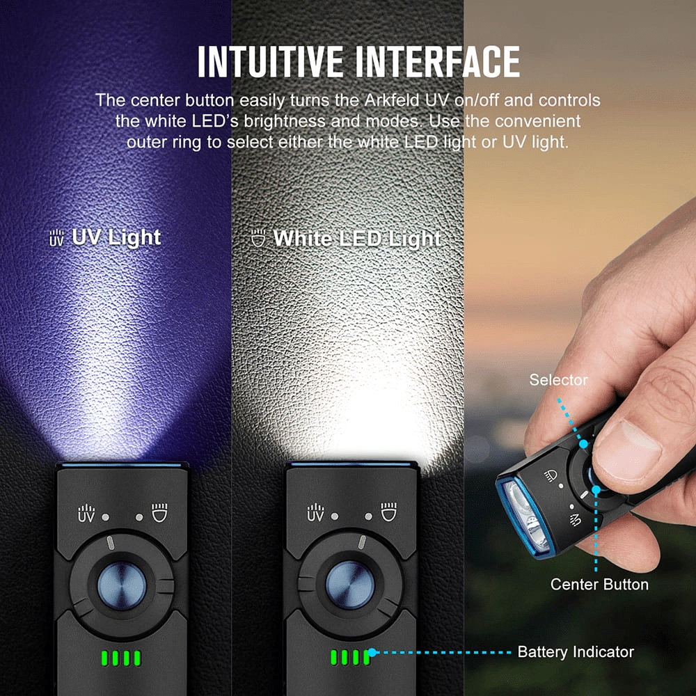 OLIGHT Arkfeld UV je žepna EDC svetilka z edinstvenim ploskim dizajnom, ki združuje nevtralno belo LED (4000–5000 K) za vsakodnevno osvetlitev in UV diodo 365 nm (580 mW) za preverjanje bankovcev, odkrivanje fluorescenčnih mineralov ali higiene površin. Največji doseg belega svetlobnega snopa je 85 m, vršna moč doseže 1.000 lm.