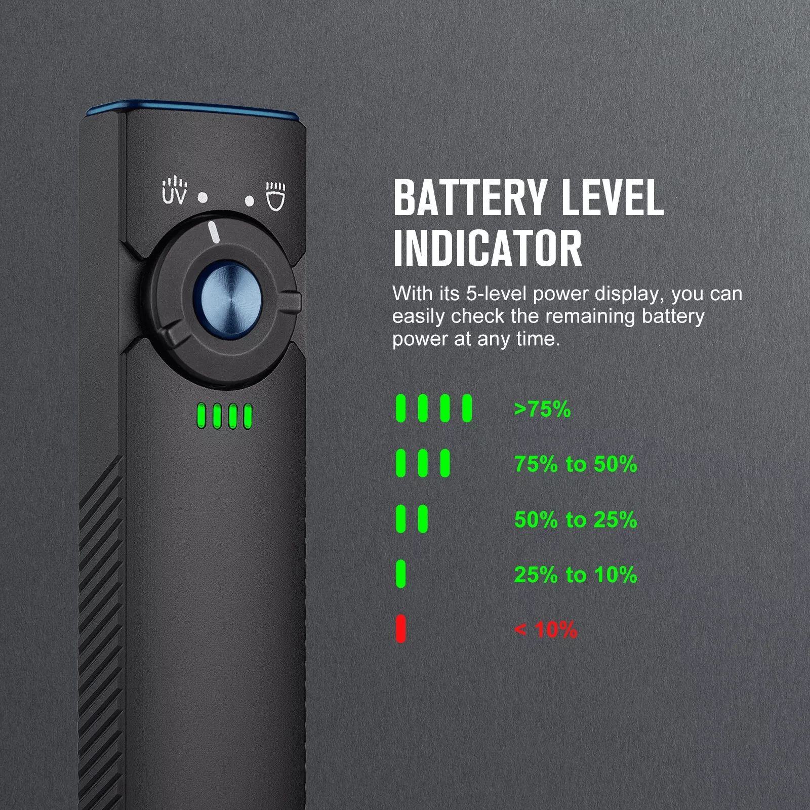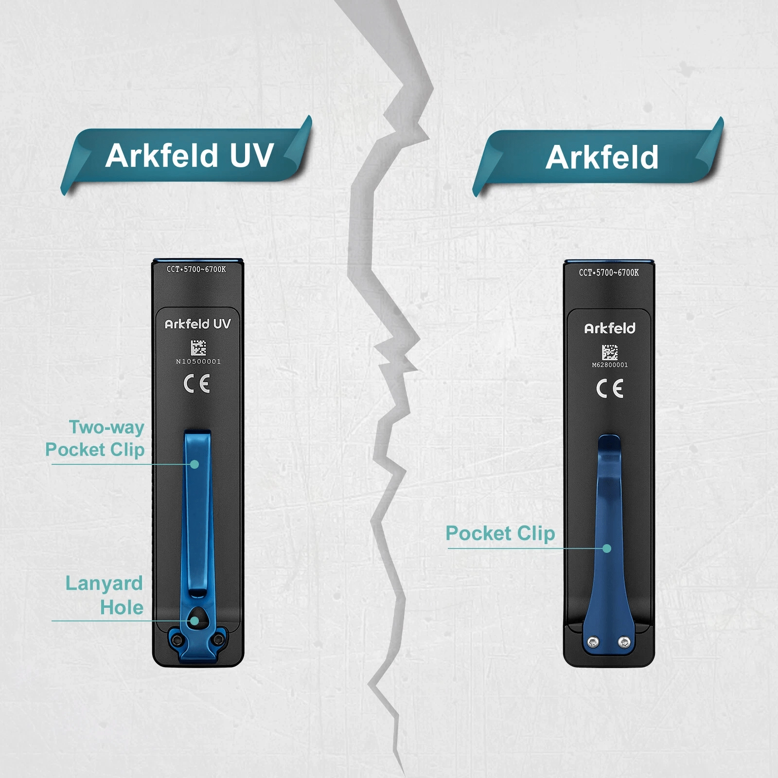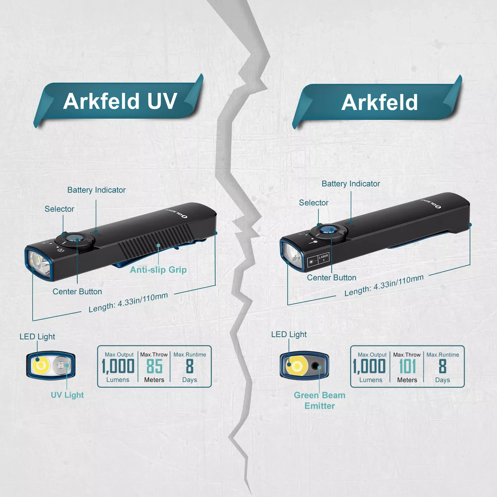 OLIGHT Arkfeld UV je žepna EDC svetilka z edinstvenim ploskim dizajnom, ki združuje nevtralno belo LED (4000–5000 K) za vsakodnevno osvetlitev in UV diodo 365 nm (580 mW) za preverjanje bankovcev, odkrivanje fluorescenčnih mineralov ali higiene površin. Največji doseg belega svetlobnega snopa je 85 m, vršna moč doseže 1.000 lm.