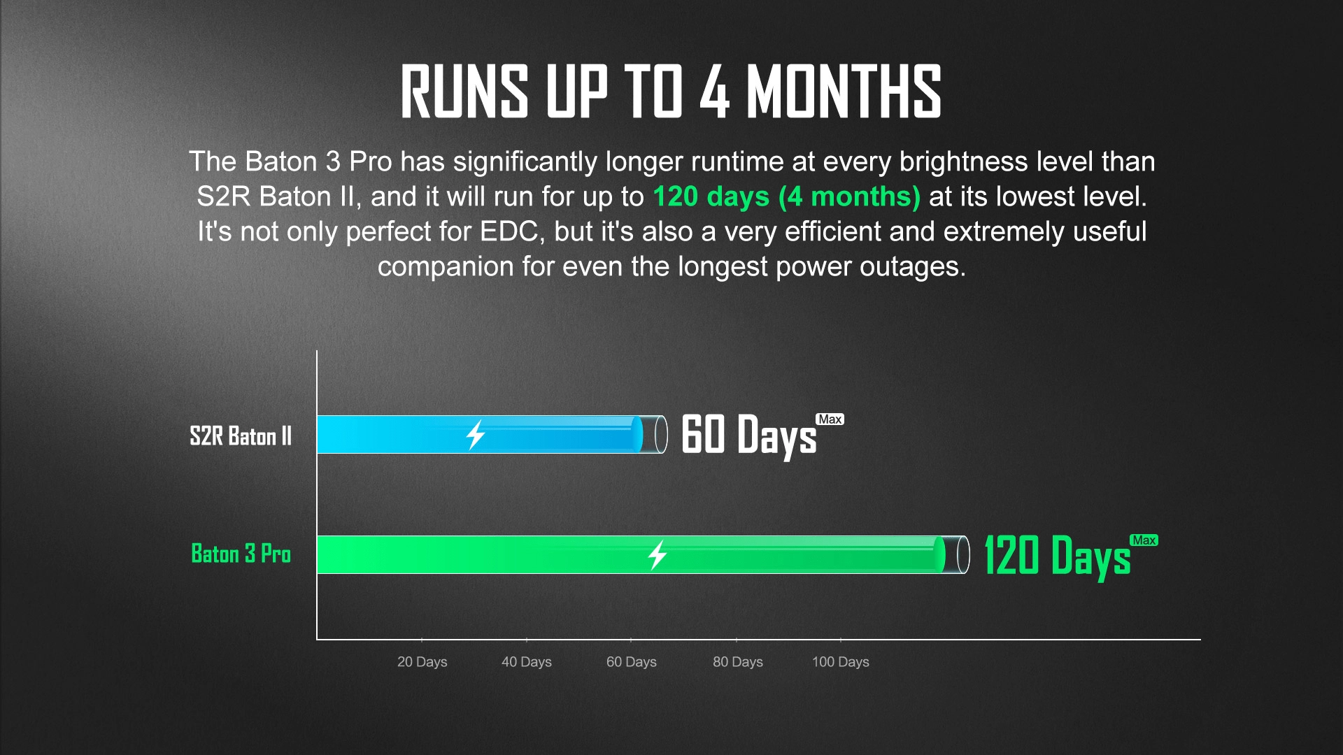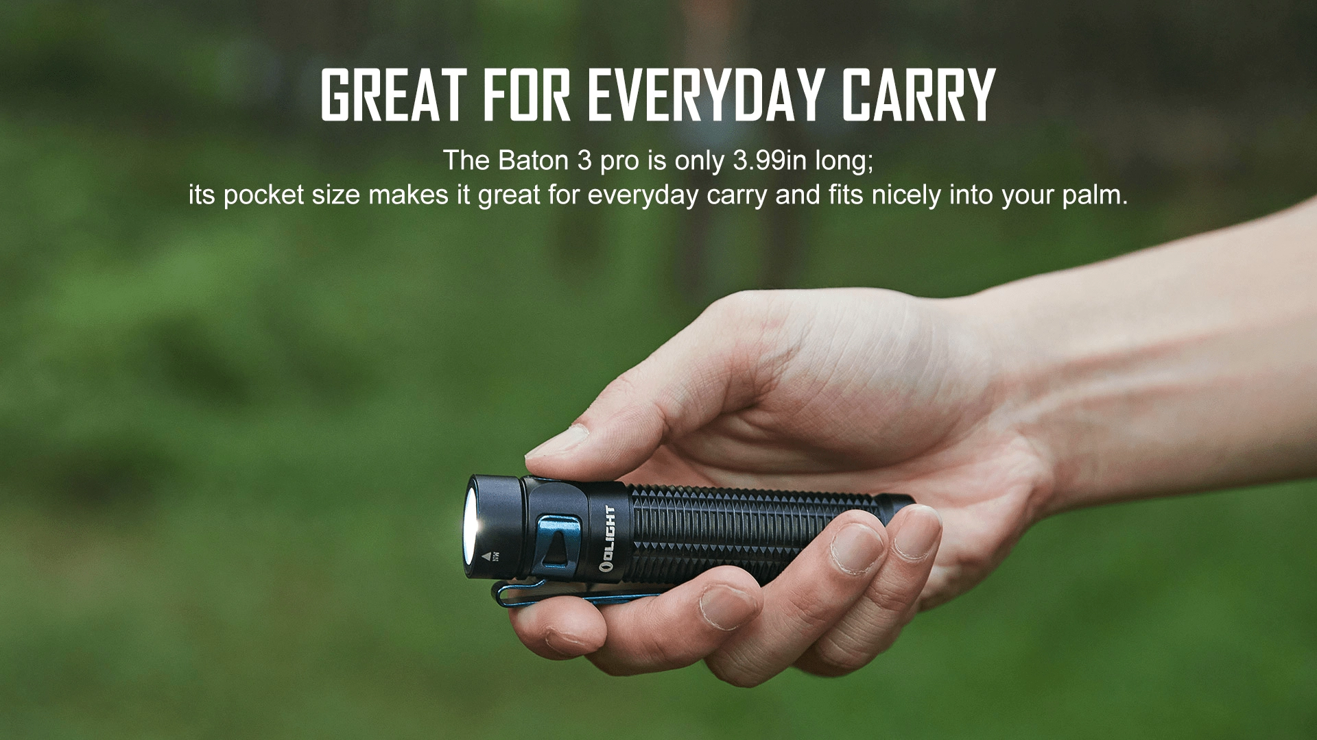 OLIGHT Baton 3 Pro CW je zmogljiva, a žepna svetilka, idealna za vsakodnevno nošenje, delo in aktivnosti na prostem. Ponuja svetlobni tok 1.500 lm z dometom 175 m ter izjemno avtonomijo do 120 dni v nizkih načinih. Zahvaljujoč kompaktnim meram (dolžina 10,13 cm) in masi 103 g jo zlahka pospravite v dlan, žep ali nahrbtnik.