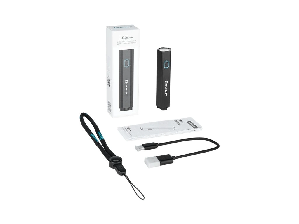 - Svetilka Olight Diffuse (baterija vključena), USB‑C kabel, vrvica za vrat, uporabniški priročnik