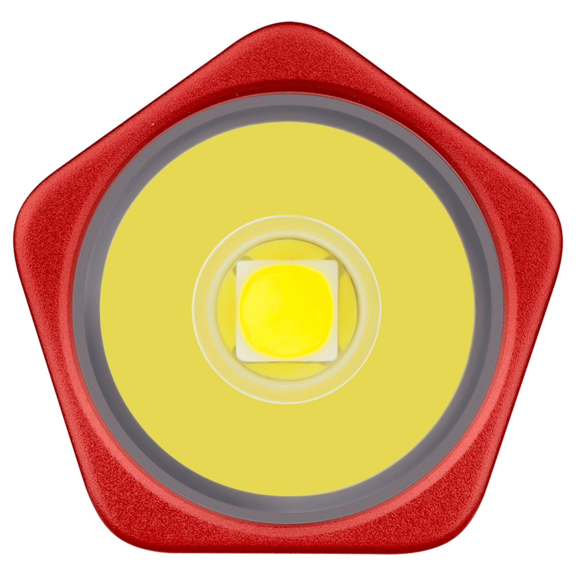 Intuitivno stransko stikalo ponuja 5 stopenj svetilnosti + stroboskop, okrog njega pa je indikator napajanja (zelena/oranžna/rdeča) za hiter pregled energije. Zgradba iz aluminijeve zlitine, kompaktne mere in petkotna oblika zagotavljajo zanesljiv oprijem tudi z rokavicami.