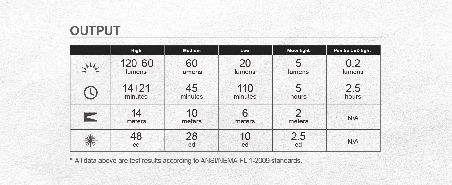 - Visok: 120→60 lm (14 + 21 min), Srednji: 60 lm (45 min), Nizki: 20 lm (110 min), Moon: 5 lm (5 h)