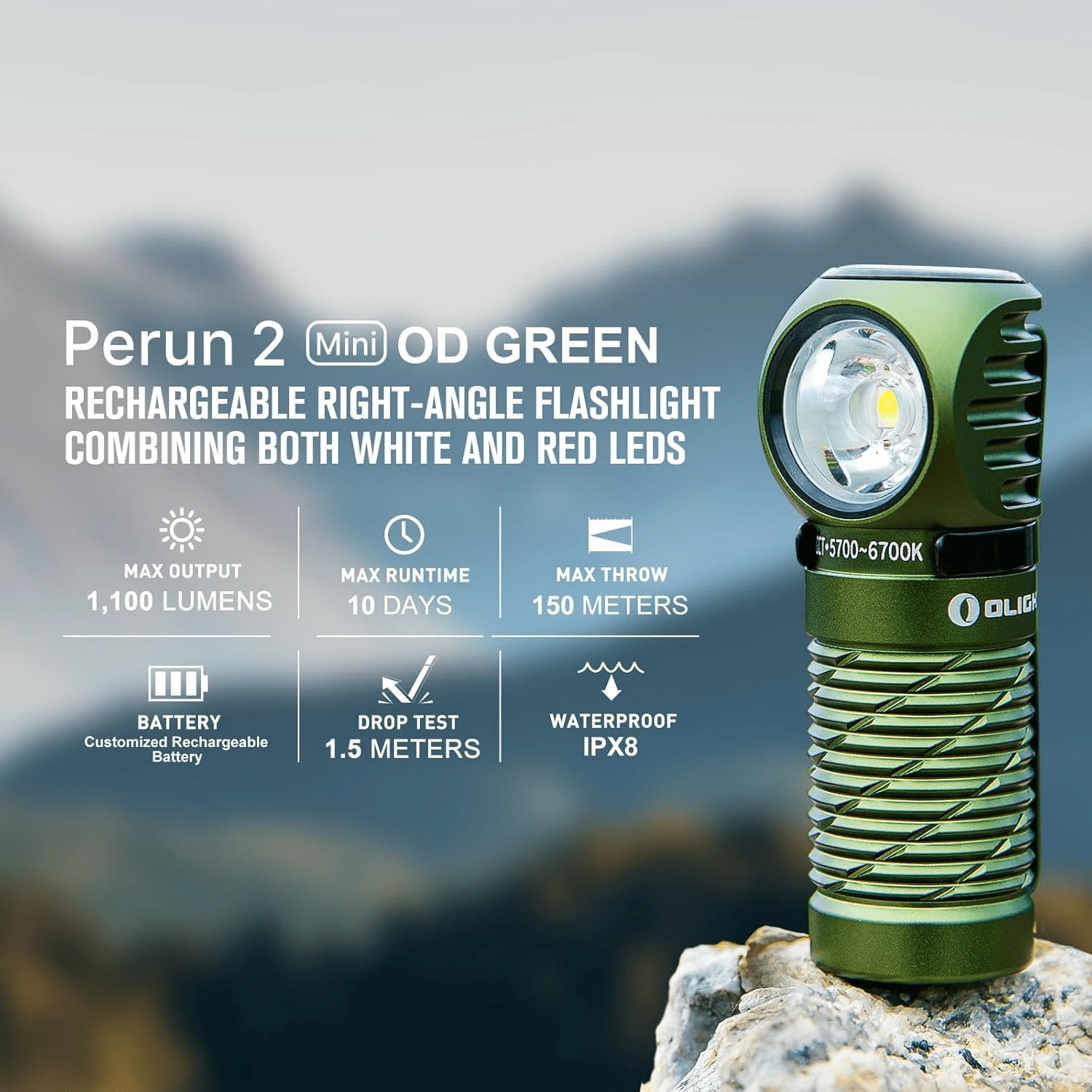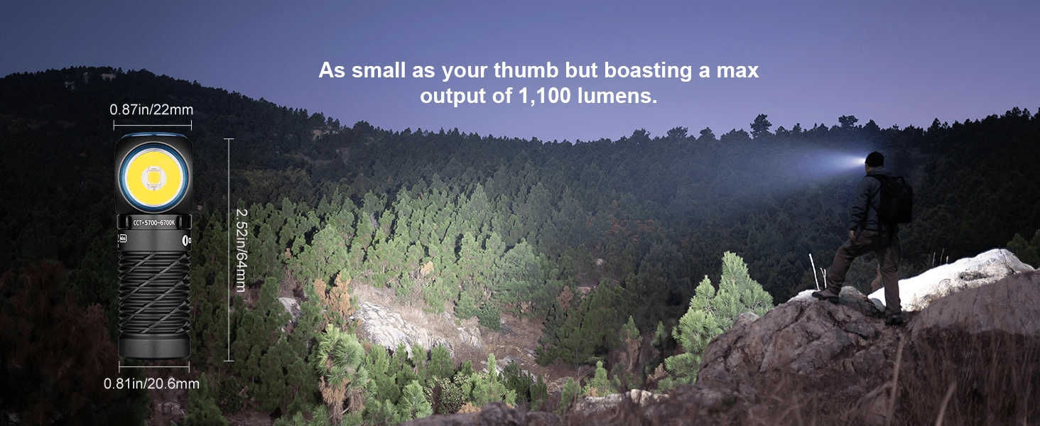 OLIGHT Perun 2 Mini je večnamenska naglavna in žepna svetilka, ki zlahka obvlada vsakodnevno nošenje, bivanje na prostem in delo v delavnici. Ponuja močno belo svetlobo do 1100 lm z dometom 150 m ter praktično rdečo svetlobo za ohranjanje nočnega vida ali nujno signalizacijo. Zaradi pravokotne glave, magnetnega zaključka in trdne sponke jo preprosto uporabite na naglavnem traku, na šiltu kape, na pasu nahrbtnika ali pritrjeno na kovinsko površino.