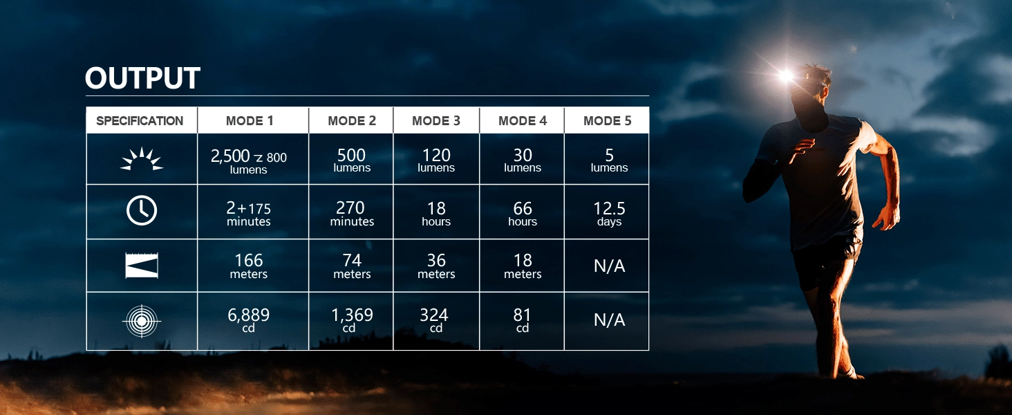 - Turbo 2500 → 800 lm / 2,5 min + 175 min; Visok 500 lm / 270 min; Srednji 120 lm / 18 h; Nizek 30 lm / 66 h; Moonlight 5 lm / 12,5 dneva; SOS/Svetilnik