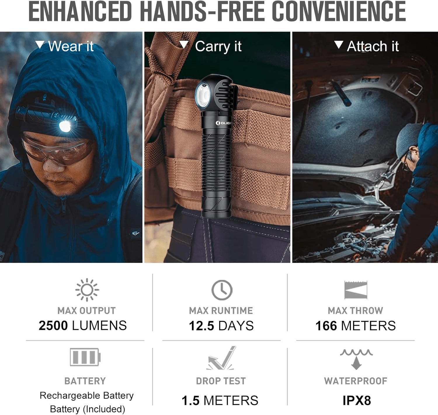 Svetilka Olight Perun 2 združuje zmogljivost, varnost in udobje. Pravokotna glava s kakovostno LED zagotavlja širok in svetel snop do 2500 lumnov, medtem ko senzor bližine samodejno prilagaja intenziteto, da prepreči bleščanje in pregrevanje. Vzdržljivo ohišje iz letalskega aluminija z izrazitim teksturiranjem odlično sede v roko tudi z rokavicami.