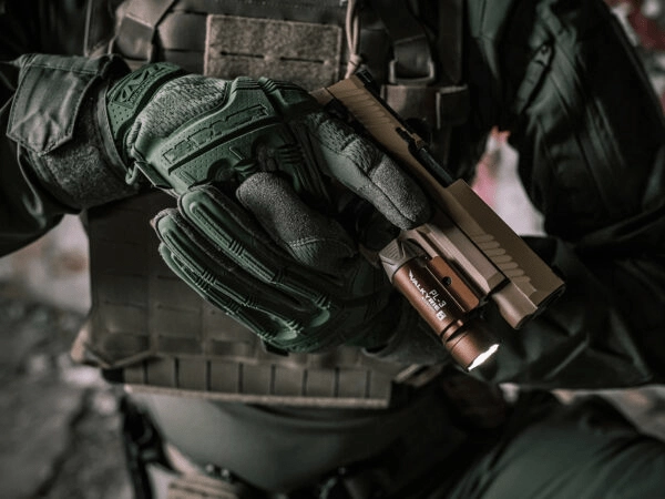 Varnostno pritrjevanje zagotavlja vijačni zaklepni mehanizem, združljiv z letevmi Picatinny 1913 in Glock (GL). Svetilka zanesljivo deluje pri taktični uporabi v zahtevnih pogojih zahvaljujoč robustni aluminijasti konstrukciji (6061‑T6) s trdo anodizacijo tipa III, odpornosti na udarce z višine 1 m in zaščiti IPX6. Aktivno upravljanje temperature samodejno znižuje izhodno moč, da zaščiti LED pred pregrevanjem.