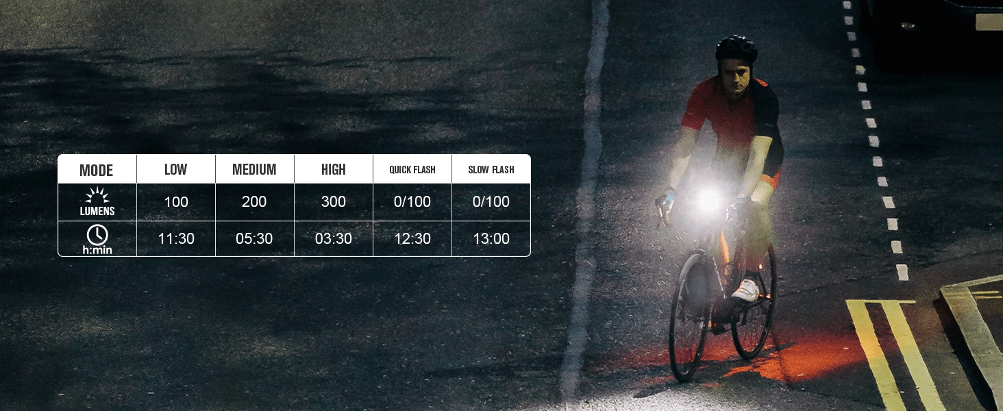 - Visok 300 lm (3,5 h), Srednji 200 lm (5,5 h), Nizek 100 lm (11,5 h), Počasno utripanje 0/100 lm (13 h), Hitro utripanje 0/100 lm (12,5 h)