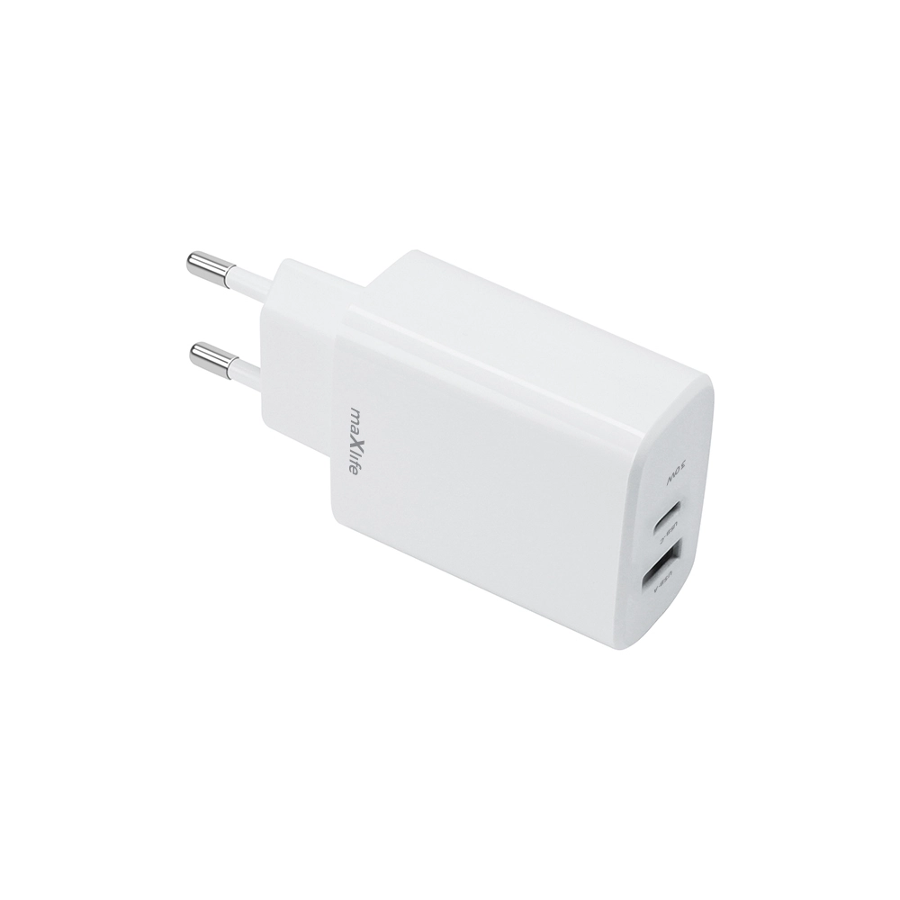 Univerzalni stenski polnilec MAXLIFE 30 W združuje sodobna standarda USB‑C PD in USB‑A QC, zato zanesljivo napolni telefone, tablice, slušalke ter manjše prenosnike ali konzole. Zahvaljujoč inteligentnemu upravljanju moči se prilagodi priključeni napravi in zagotovi največjo hitrost brez pregrevanja.