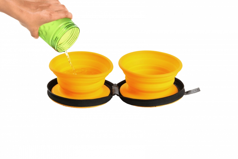 Praktičen komplet dveh zložljivih skled iz kakovostnega silikona za hrano in vodo – vsaka s prostornino 350 ml. Sklede so shranjene v trpežnem etuiju z ježkom za pritrditev in varnim zadrževalnim zadrgom za enostavno prenašanje na poti.